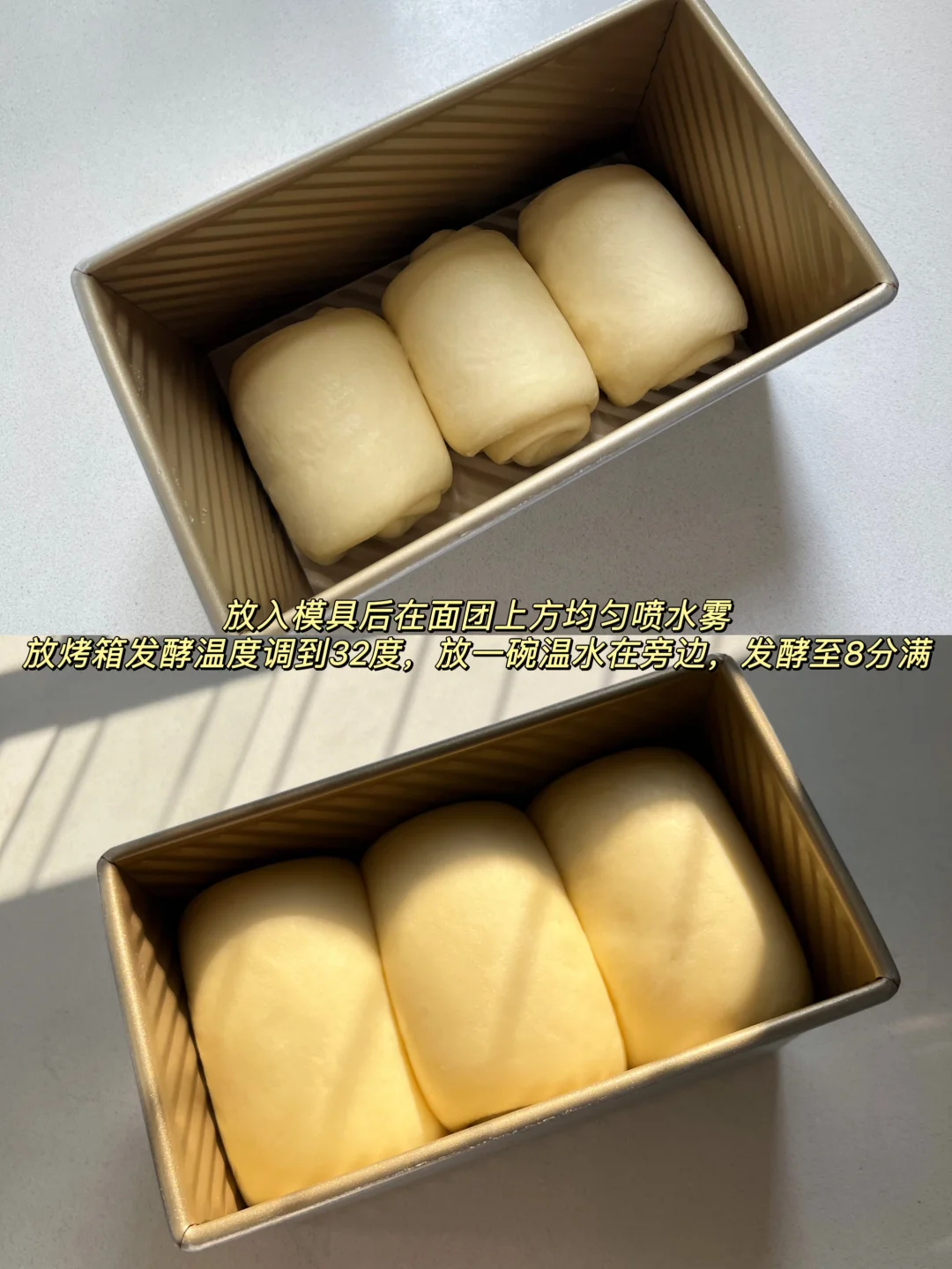 4⃣️放入烤箱同时放入一碗热水,发酵功能32度发酵至8分满,取出盖上吐司盒盖,同时预热烤箱。