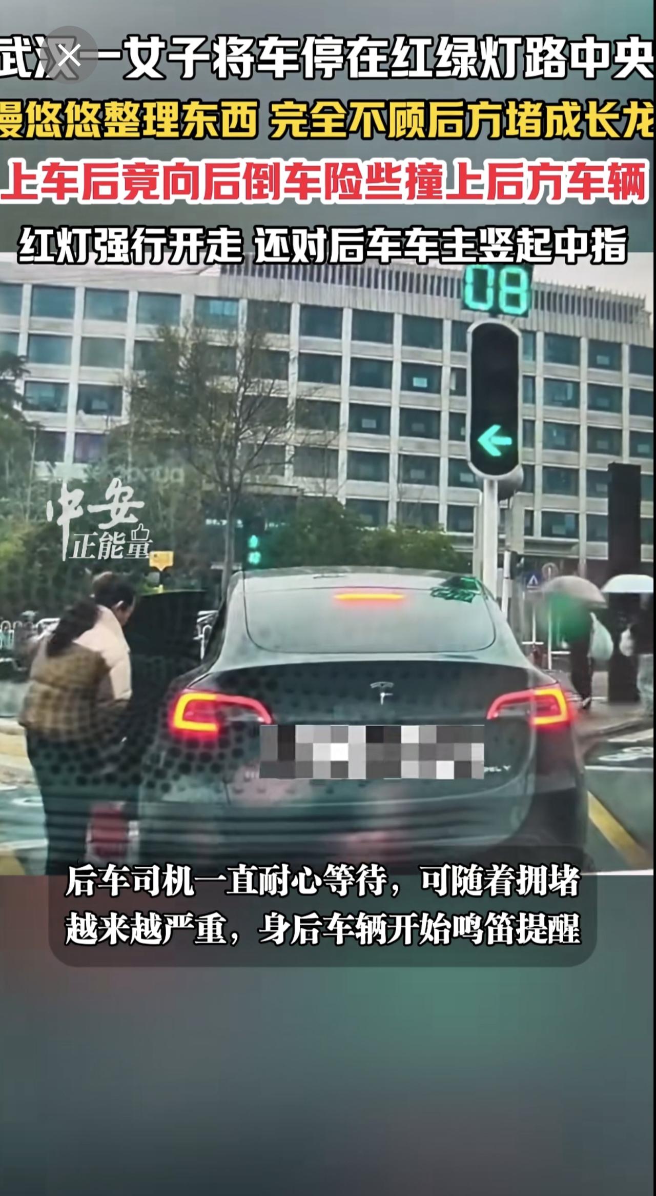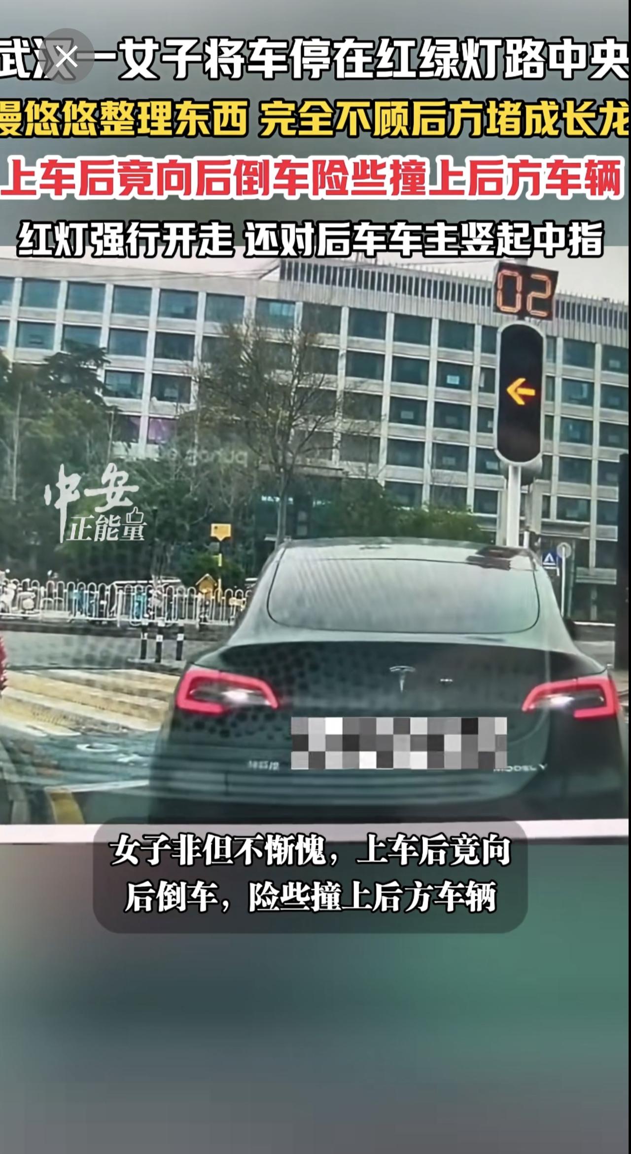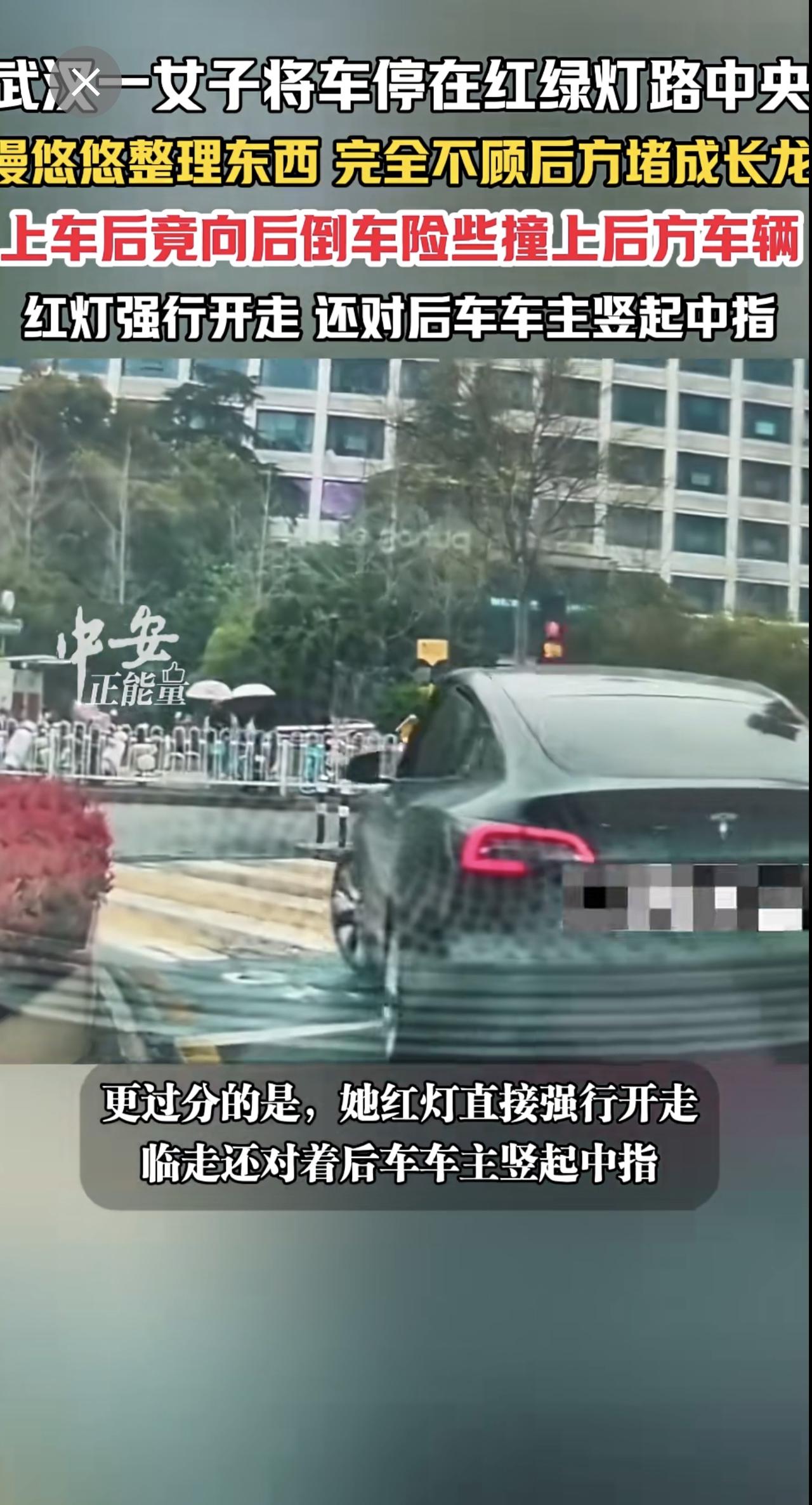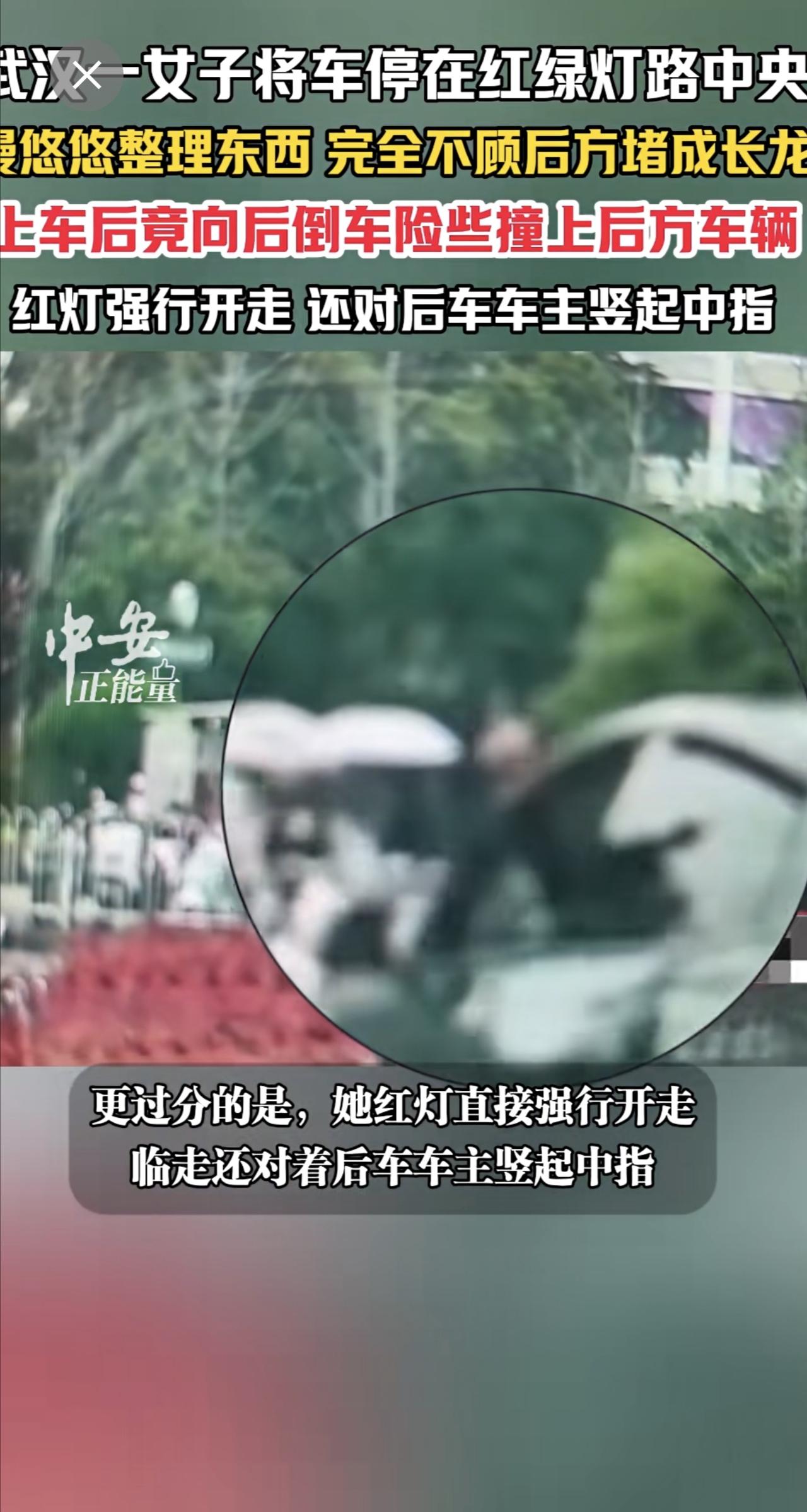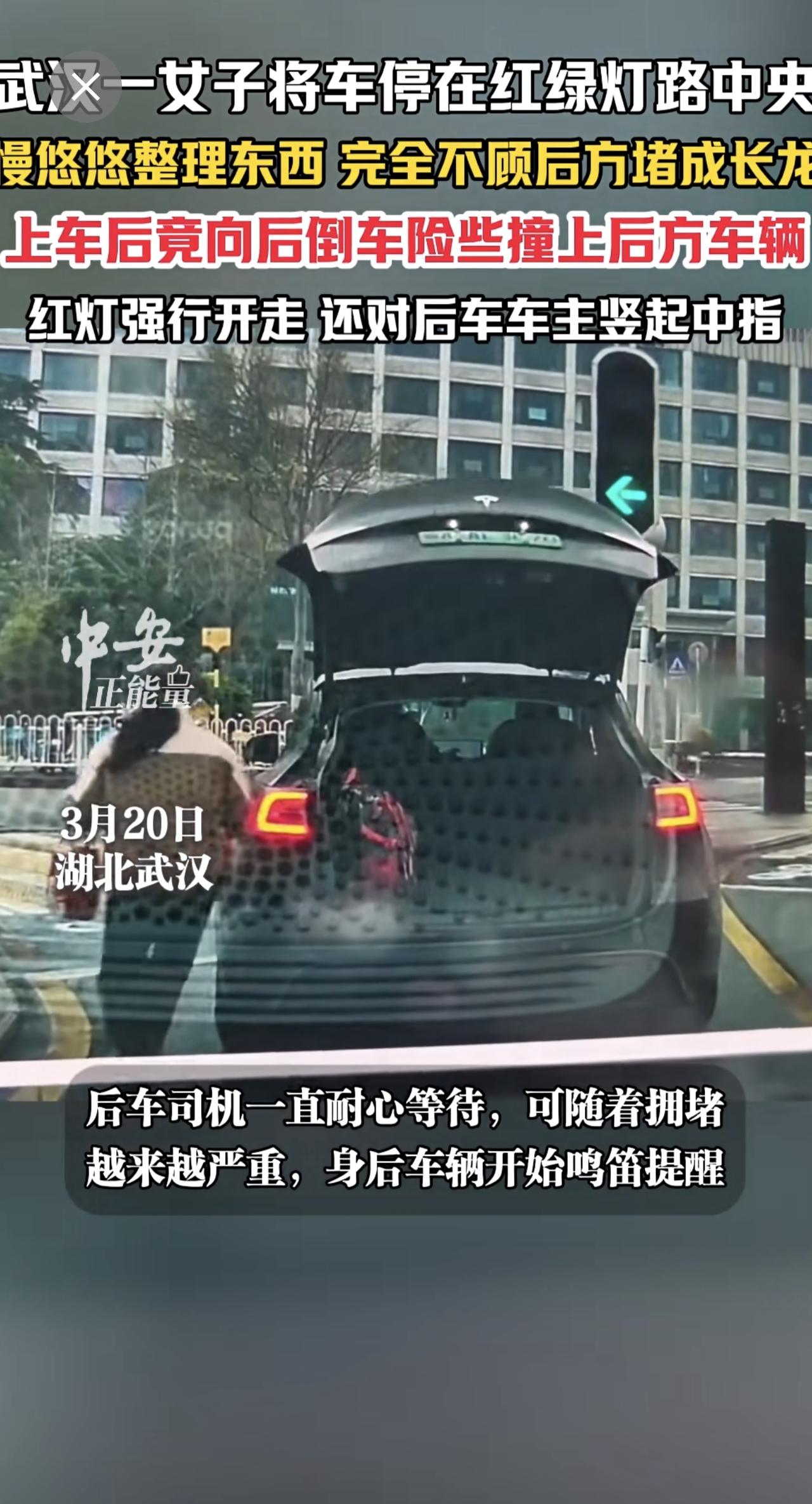 3月20日,湖北武汉光谷步行街附近红绿灯路口。一女子将车停在红绿灯路中央,慢悠悠整理东西,完全不顾后方已堵成长龙。女子非但不惭愧,上车后竟向后倒车,险些撞上后方车辆。更过分的是,她红灯直接强行开走,临走还对着后车车主竖起中指。(编辑:曼曼)