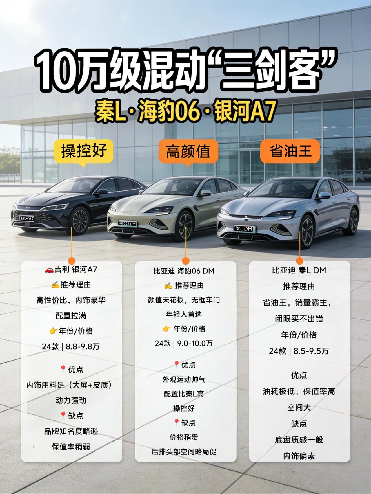 10万级混动家轿怎么选?秦L DM、海豹06 DM、银河A7二手车避坑指南 2026年3月,10万级混动家轿市场“卷”出新高度。如果你预算10万左右,想买一辆省油、空间大、配置高的二手车,比亚迪秦L DM、海豹06 DM,以及吉利银河A7,绝对是绕不开的“三剑客”。 这三款车都是2024-2025年才上市的新车,现在二手市场上车源多、车况新,性价比极高。但它们的风格差异很大,今天咱们就聊聊,到底怎么选才不踩坑。 🚗一、比亚迪秦L DM:销量王,闭眼入的“省油神车” 👉二手车行情(2024款 80km 领先型):8.5-9.5万 秦L DM是比亚迪2024年的爆款,主打“极致性价比”。目前二手市场上2024年上牌的车源最多,里程普遍在1-2万公里。 👉优点: - 油耗极低:搭载比亚迪第五代DM-i混动技术,亏电油耗仅2.9L/100km,满油满电综合续航超1200km,日常通勤用电,长途自驾用油,用车成本比坐地铁还低。 - 空间宽敞:车长接近4米8,轴距2米79,后排腿部空间宽敞,后备箱能轻松装下婴儿车+露营装备,完全满足三口之家需求。 - 保值率稳:作为销量冠军,秦L DM的二手流通性极好,买它不用担心“接盘”风险。 👉缺点: - 内饰简约:虽然用料环保,但设计偏实用风格,缺乏豪华感,部分用户觉得“塑料感”稍强。 - 底盘质感一般:后悬架为扭力梁非独立悬架,过减速带时颠簸感明显,不如独立悬架舒适。 👉选购建议:适合预算有限、追求极致省油、对空间和保值率有要求的家庭用户。重点关注2024款 80km 领先型,性价比最高。 🚗二、比亚迪海豹06 DM:运动外观,年轻用户的“颜值担当” 👉二手车行情(2024款 80km 尊贵型):9-10万 海豹06 DM和秦L DM是“兄弟车型”,但设计更偏向年轻运动,主打“低趴轿跑”风格,2024款尊贵型二手车价格在9-10万左右。 👉优点: - 颜值高:溜背造型+无框车门,外观时尚动感,开出去比秦L DM更有面子,深受年轻用户喜爱。 - 配置更丰富:相比秦L DM同价位车型,海豹06 DM多出了L2级辅助驾驶、全景天幕、皮质座椅等配置,科技感和舒适性更强。 - 操控更好:后悬架为四连杆独立悬架,底盘调校偏运动,过弯支撑性更好,驾驶乐趣比秦L DM高。 👉缺点: - 空间略小:为了追求运动造型,后排头部空间稍显局促,高个子乘客长时间乘坐可能会觉得压抑。 - 维修成本稍高:无框车门的密封条和玻璃升降器维修成本比普通车门高,日常使用需注意保养。 👉选购建议:适合年轻用户、注重颜值和操控、对配置要求较高的消费者。建议选择2024款 80km 尊贵型,配置均衡,性价比突出。 🚗三、吉利银河A7:后起之秀,配置拉满的“性价比之王” 👉二手车行情(2025款 120km 星舰版):9.5-10.5万 银河A7是吉利2025年推出的重磅车型,主打“越级配置”,2025款星舰版二手车价格在9.5-10.5万左右,车源较新,里程普遍在5000公里以内。 👉优点: - 配置越级:同价位车型中,银河A7多出了副驾零重力座椅、HUD抬头显示、燕飞利仕音响等豪华配置,内饰质感和科技感远超同级。 - 续航更长:纯电续航120km(CLTC),比秦L DM和海豹06 DM的80km更长,日常通勤基本可以纯电行驶,进一步降低用车成本。 - 底盘扎实:后悬架为多连杆独立悬架,底盘调校偏舒适,过坑洼路面时滤震效果好,乘坐舒适性优于比亚迪两款车。 👉缺点: - 品牌认知度稍弱:相比比亚迪,吉利银河的品牌影响力稍弱,二手保值率可能略低。 - 车机系统一般:虽然配置高,但车机系统的流畅度和生态丰富度不如比亚迪DiLink系统,部分用户反馈操作逻辑稍复杂。 👉选购建议:适合追求高配置、长续航、舒适驾乘体验的用户。重点关注2025款 120km 星舰版,配置越级,性价比极高。 ✍️四、总结:怎么选? - 追求极致省油+保值率:选比亚迪秦L DM,闭眼入,用车成本最低。 - 注重颜值+操控+配置:选比亚迪海豹06 DM,运动外观+独立悬架,驾驶乐趣更高。 - 想要越级配置+长续航+舒适性:选吉利银河A7,同价位配置拉满,舒适性最佳。 避坑指南: - 检查电池健康度:三款车均为插电混动车型,购买时务必检查动力电池健康度,确保续航无衰减。 - 试驾底盘:重点关注底盘是否有异响、减震是否正常,避免买到事故车或底盘受损车辆。 - 查询维修记录:通过第三方平台查询车辆维修保养记录,避免买到泡水车或重大事故车。 2026年3月,10万级混动家轿市场选择丰富,秦L DM、海豹06 DM、银河A7各有千秋,根据自己的需求和预算,总能找到适合自己的“梦中情车”。【来自懂车帝车友圈】