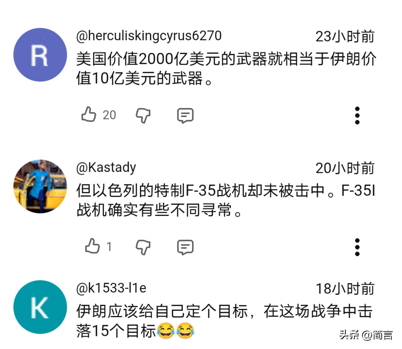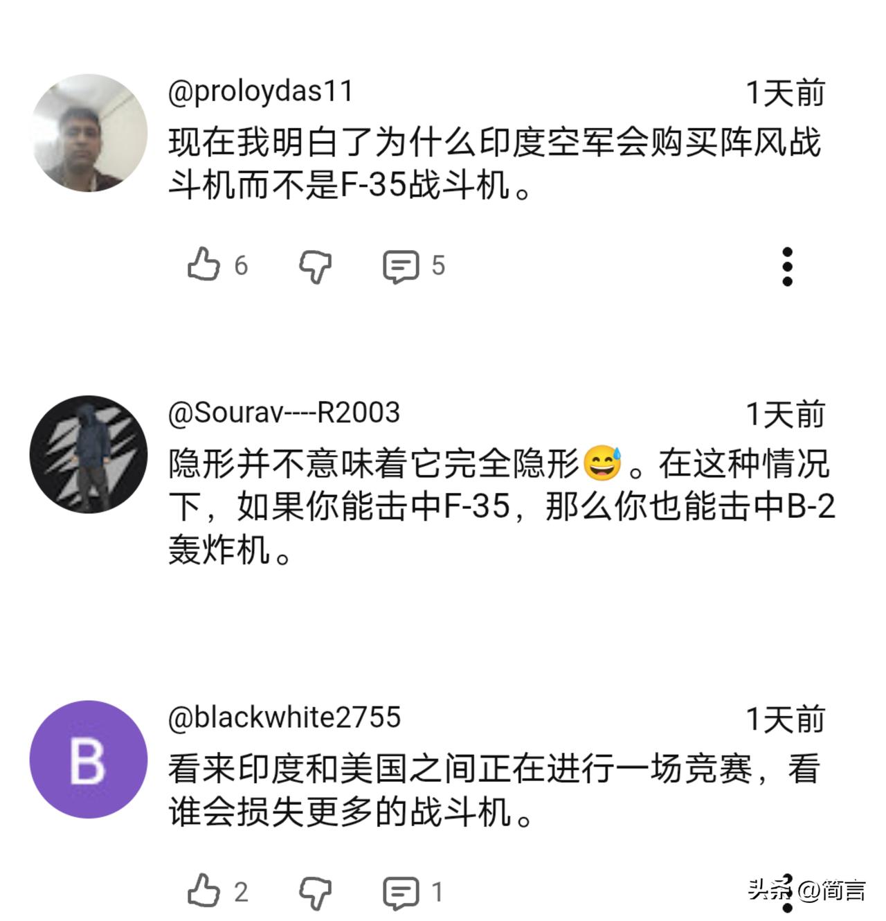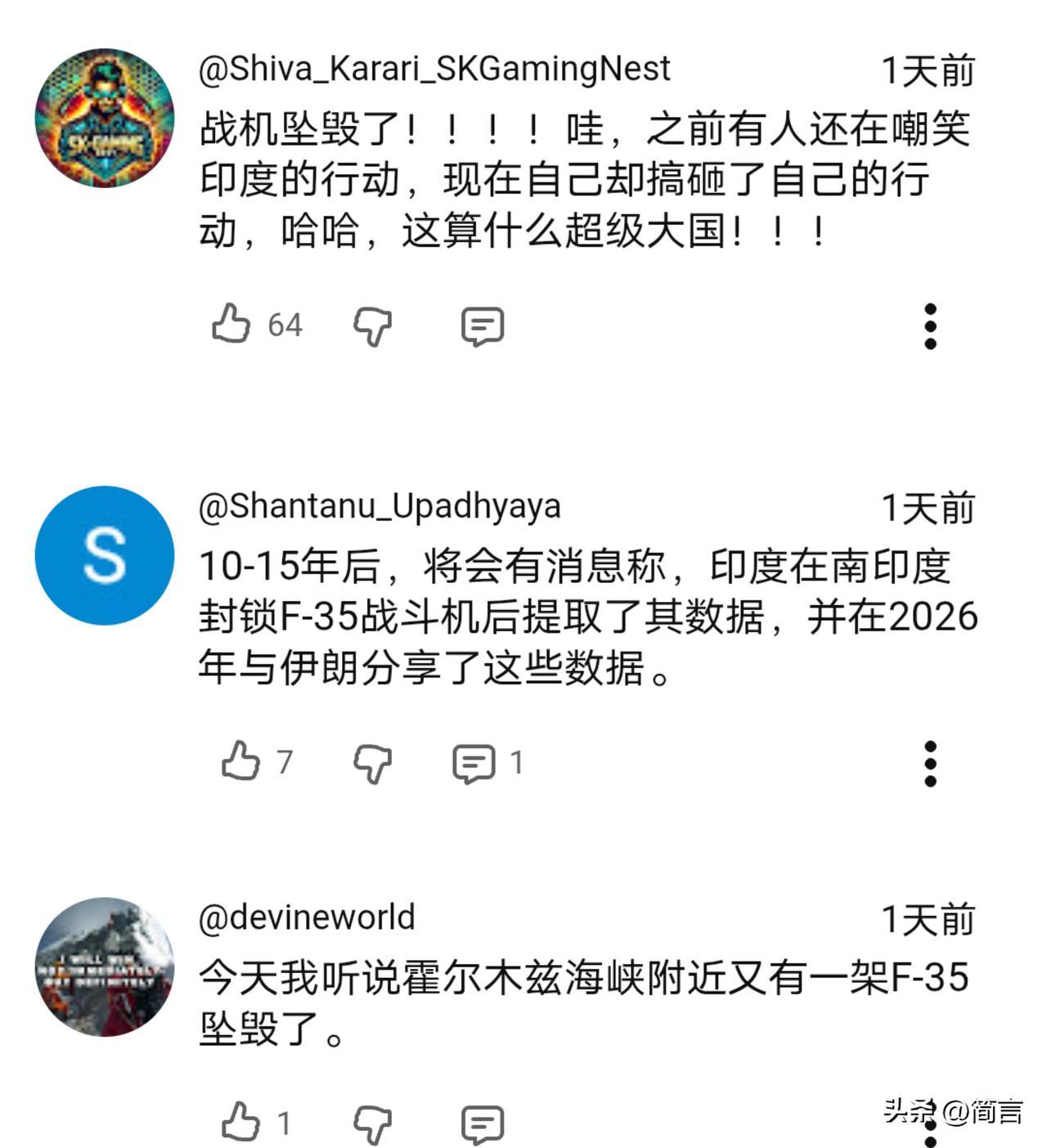 F35被击中!印网友:伊朗获得了印度的帮助… 据印媒3月21报道,一架美军的F35战机在执行任务时被伊朗的防空部队击中,后迫降于位于中东的美军基地。同时印媒还披露,美伊冲突至今,美军共损失了16架军机。 消息传出,引发热议。有部分印网友认为,伊朗之所以能够击中身为五代机的F35,是印度向伊朗分享了F35的关键数据及提供了技术支持等。 不得不说,印度网友的想象力还真够丰富的。目前,没有任何证据表明,是印度帮助了伊朗。伊方之所以能够取的这样的战果,是及时有效的调整了战术及抓住了F35的弱点,而不是印度的帮助…