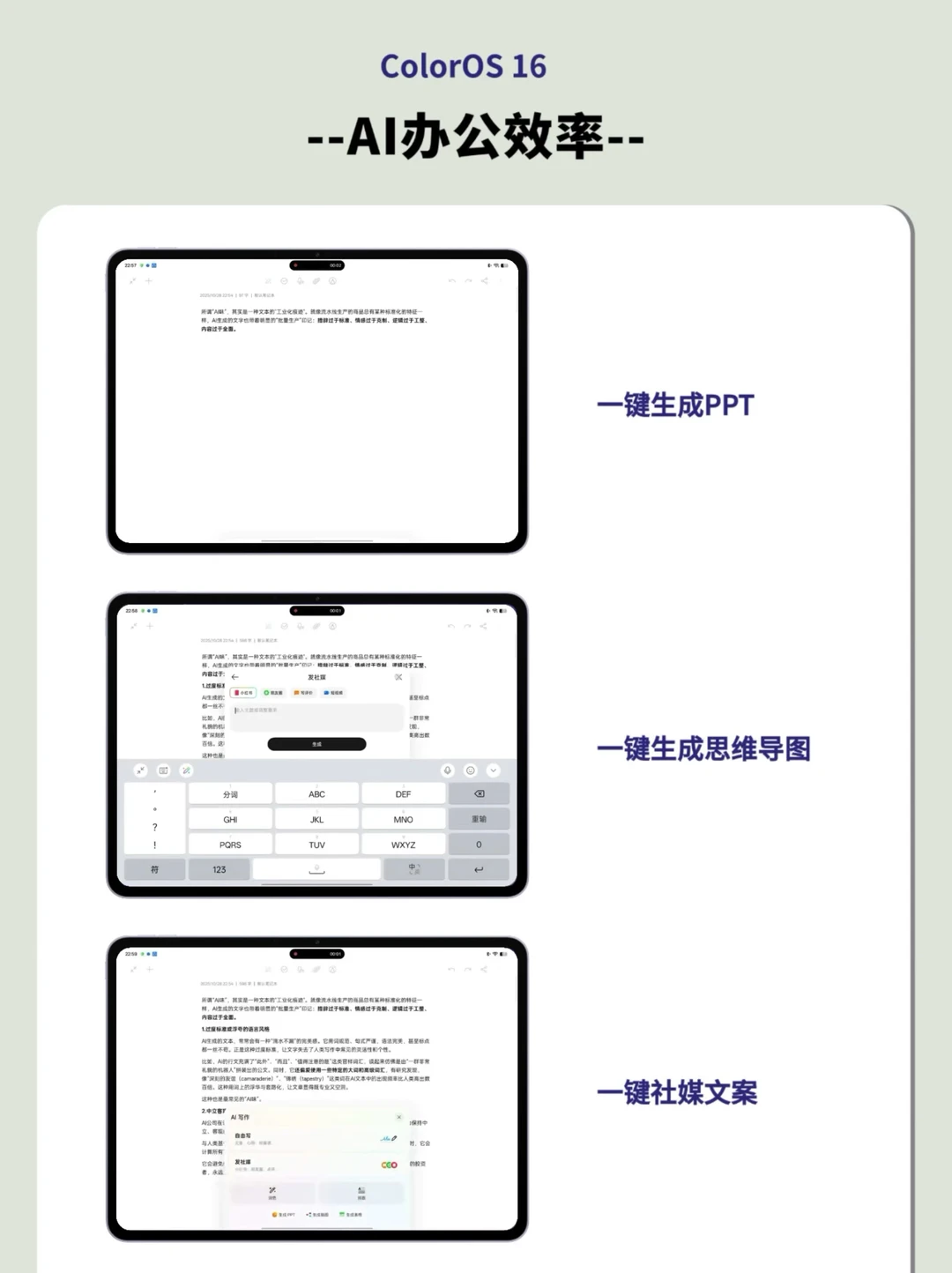 OPPO Pad 5搭载的ColorOS 16给到了不少AI效率工功能!其中AI笔记美化让手写笔记秒变工整,PC级WPS写论文超顺手,一键生成PPT和思维导图,跨设备互联无缝衔接,手机拍文档直接同步到平板~