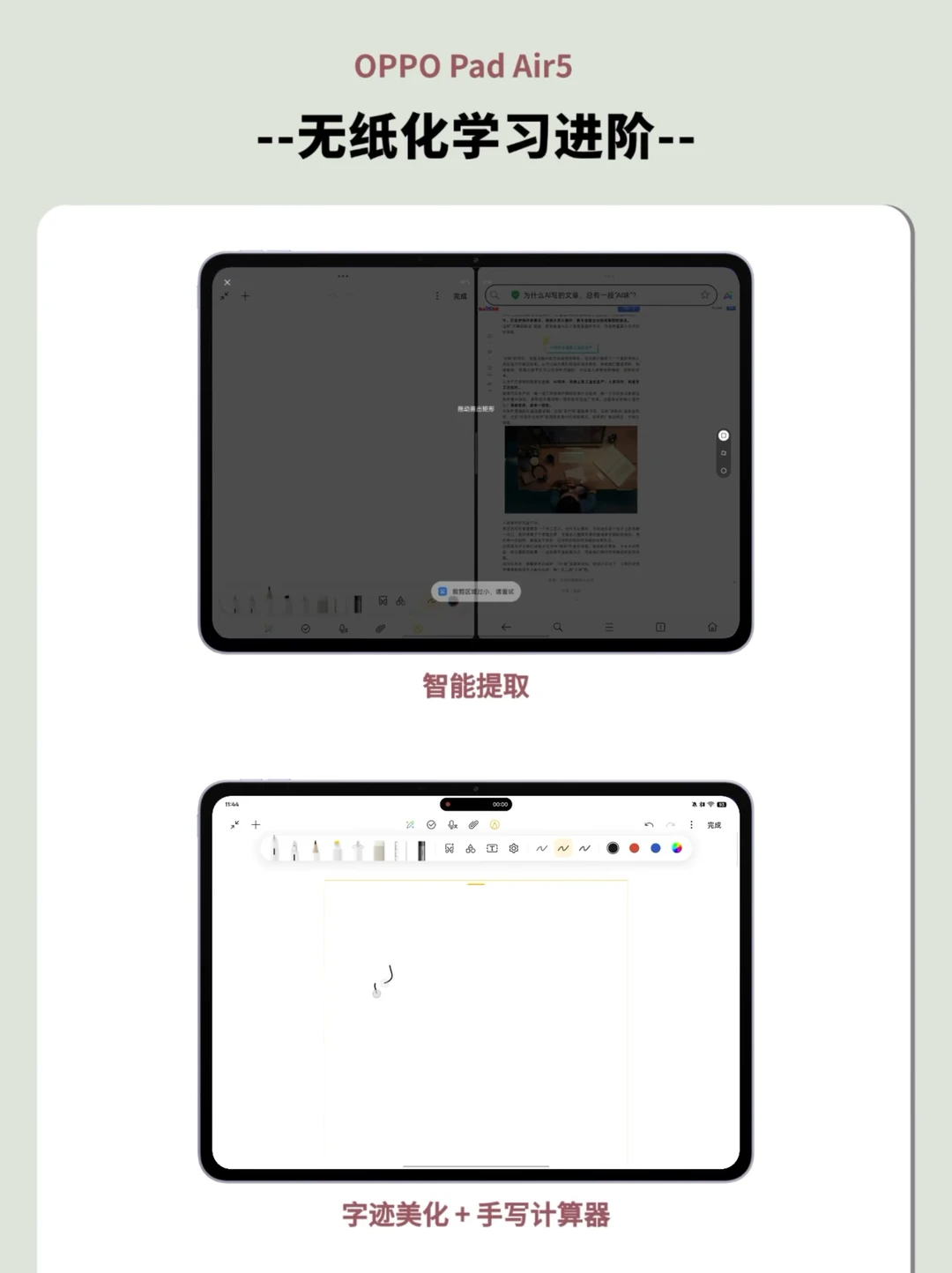 OPPO Pad Air5同样支持AI笔记基础功能,但PC级WPS需要在应用商店下,日常记笔记、看PDF足够用。