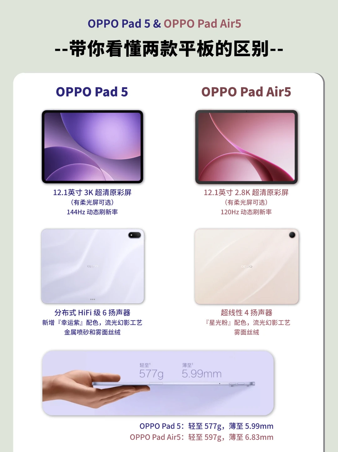 OPPO Pad 5机身轻薄(约5.99mm厚,577g),搭配幸运紫新配色,高级感和潮流属性拉满,即使是图书馆或教室随身带也没有压力~