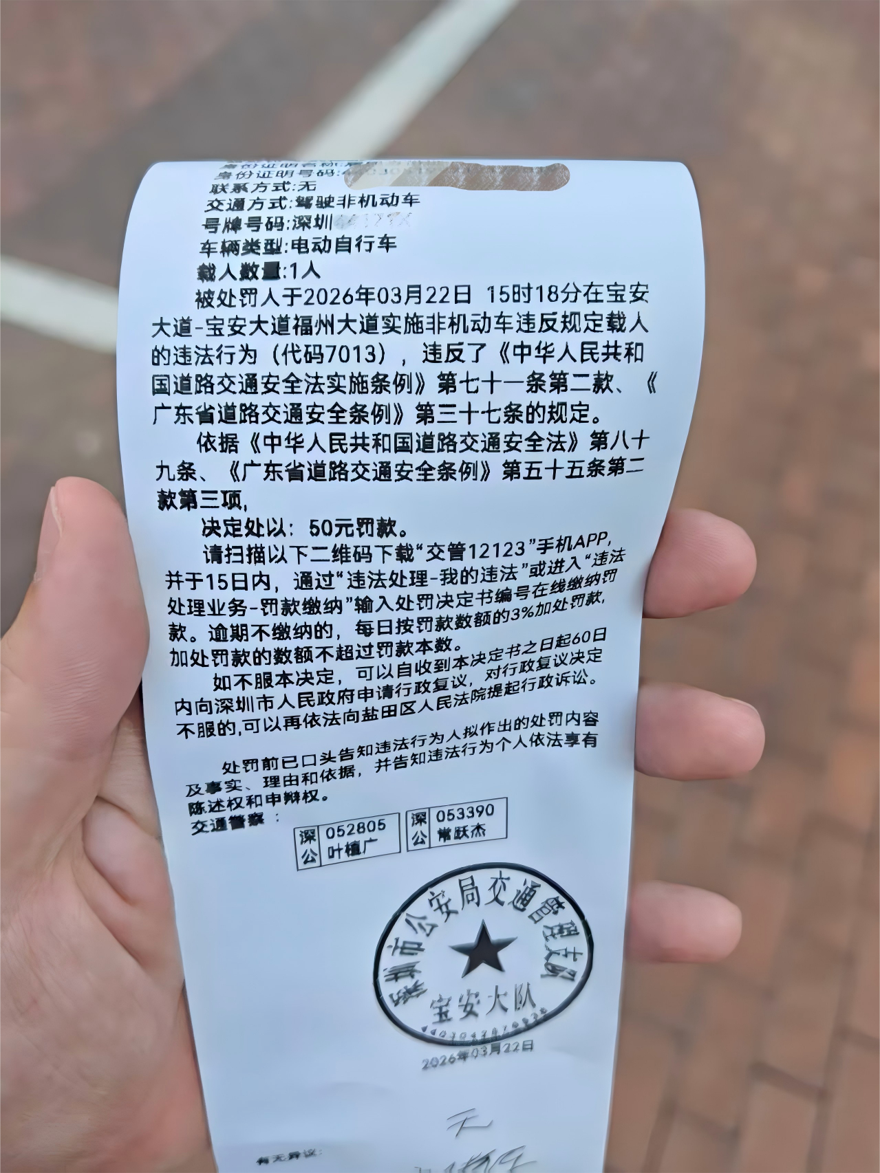 才知道深圳电动车是不能载人的,出去兜一圈结果载人被罚50米米以后再也不敢了