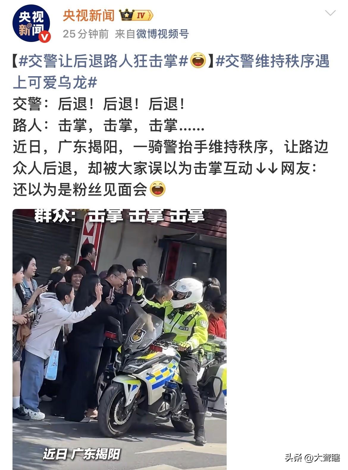 好有爱的一幕! 广东揭阳一名交警在维护秩序时路边群众以为是要击掌,纷纷举起手掌和交警亲切互动,完美体现了警民一家亲的和谐场面。