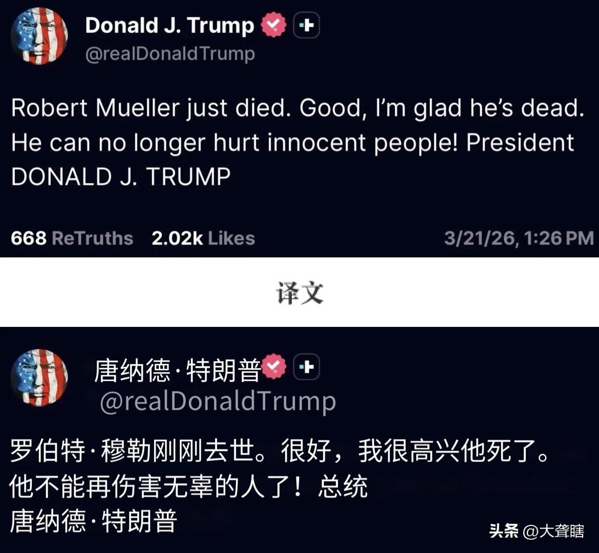 怀恨在心,特朗普称很高兴穆勒死了! 俗话都说逝者为大,当一个人去世的时候外人应该给予一定的尊重,但是特朗普似乎并不这样认为。 据外媒消息,当81岁的美国前FBI局长穆勒去世后特朗普随即在社交平台发文道:“穆勒刚刚去世了,我很高兴他死了,他再也不能伤害无辜的人”。 很显然,特朗普对于穆勒当年对发起的调查依然耿耿于怀。