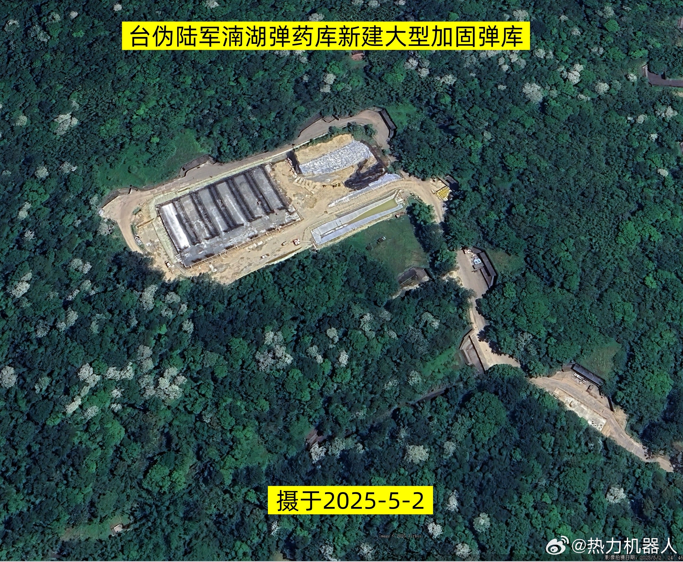 台湾军事信息 从卫星图看台伪新建的大型弹药库。台伪陆军六军团第三地区支援指挥部,下属的湳湖弹药库正在新建一大型加固弹库,坐标见(图1)。(图2)为湳湖弹药库的占地规模。其北侧1.5km处有另一座明湖弹药库,规模小于湳湖弹库,同属伪陆军三支部弹药库管辖。从(图3-图4)可见,湳湖弹库正在修建一座大型千吨级的弹药库,位于湳湖弹药库西南侧,整体式钢筋混凝土结构,内部分隔为六座独立的库房。库外的预留的车辆通道宽敞,方便导弹、远程火箭弹等大型弹药的储运。(图5)为台伪人员在湳湖弹库进行作业训练,湳湖弹库大体分南部,中部,西北部,北部四个区域。其中,南部区域有营区出入口,营区住办大楼,湳湖第二弹药整修所人员宿舍等设施。南部部分原有12个加固弹药库(图6),距离民房直线距离不到200米。中部区域有9个加固弹药库,其中13号弹库无伪装(图7)。西北部分为轻兵器及火药销毁区(图8)。北部部分有4个加固弹药库(图9),其中22号弹库无伪装,整个湳湖弹药库原有25座加固库房,目前11、12号弹库已拆除新建大型弹库。同时,湳湖弹库内还设置有2座弹药整修所,用于弹药维修保养(图10-图12)。