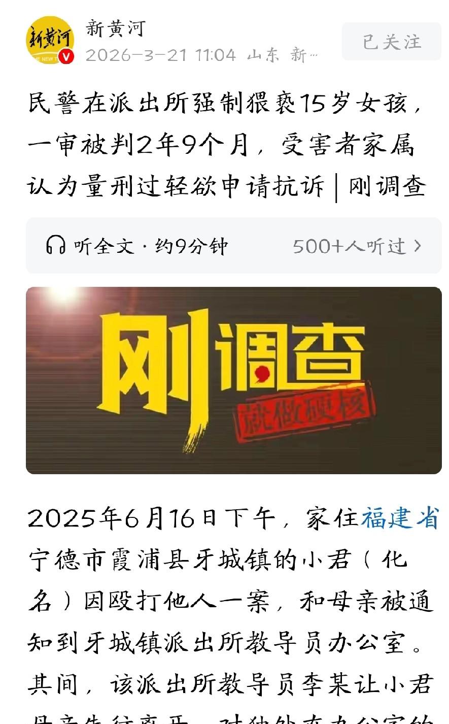 丧尽天良!福建宁德,15岁女孩因为打架,和母亲一起被叫到了派出所问话,期间,民警将母亲支开,在办公室以拘留威胁,摸了女孩胸部,甚至强迫女孩用嘴。女孩回家后情绪反常,母亲追问下才说了实话。孩子父亲怒了,找民警质问,谁知他死活不承认,一口咬定是污蔑。父亲马上报案,经过调查,在男子办公室垃圾桶里、裤子、警服下摆和女孩鞋带上,都提取到了他的DNA。最终,法院以强制猥 亵对男子判刑,但判决结果让女孩一家无法接受。   小女孩的父亲张先生是山东人,2007年便落户宁德霞浦牙城镇,在这座滨海小镇扎根经商近二十年,一心盼着全家安稳度日。   小君从小在当地长大,初一曾因成绩不佳送往封闭式学校矫正,回归后性情乖巧不少,父亲正忙着为她张罗复学事宜,平静的生活却被一场突如其来的纠纷彻底打碎。   2025年6月16日,小君因与他人发生肢体冲突,在母亲陪同下前往牙城镇派出所,接受该所教导员李某的问询处理。   处理问询的过程中,李某以无关事由支开小君的母亲,将尚未成年的小君独自留在办公室内,随后利用自身执法身份的威慑力,以涉案可能被拘留为要挟,对小君实施了严重的猥亵行为。   从派出所回到家的小君,整个人陷入了极致的崩溃状态。   她不肯吃饭、不愿说话,把自己锁在房间里放声痛哭,情绪失控的模样和往日的乖巧判若两人。   在家人的耐心安抚和反复追问下,小君才颤抖着说出了在派出所遭遇的不堪经历,这份残酷的真相,让整个家庭瞬间坠入深渊。   起初得知消息的张先生,根本不愿相信这是事实。   在他的认知里,派出所是百姓的安全港湾,执法人员更是正义的守护者,绝不可能做出违背职业道德、突破人性底线的恶行。   直到电话里传来女儿撕心裂肺的哭声,他才不得不接受现实,当即致电李某对质,可对方不仅矢口否认,还反咬家属污蔑,试图掩盖罪行。   清醒的张先生没有过多纠缠,第一时间向上级公安部门报案,用法律途径为女儿讨公道。   当晚,李某便被带走接受调查,随着物证鉴定工作的推进,完整的证据链彻底击碎了李某的谎言。   李某办公室内、衣物上以及小君鞋子上提取的生物检材,均与李某的基因分型完全吻合,铁证如山,犯罪事实无从抵赖。   2026年3月16日,霞浦县人民法院作出一审判决,李某因犯强制猥亵罪,被判处有期徒刑二年九个月,庭审中李某未提起上诉。   法院审理时认定,李某存在侵害未成年人、利用职务便利犯罪、手段恶劣三项从重情节,却又因其认罪认罚情节予以从轻量刑,最终作出折中判决。   当地公安部门也表示,待判决生效后,将对李某作出开除公职的处理,这样的判决结果,不仅让张先生一家难以接受,也让众多网友心生不解。   李某身为派出所教导员,身负执法普法、守护群众的职责,却知法犯法、执法犯法,利用职权胁迫侵害未成年人,性质远比普通犯罪更为恶劣。   案件发生后,小君的身心遭受了不可逆的重创,她频繁被噩梦缠身,情绪时常崩溃,甚至出现自残行为,先后四次离家出走,最终只能辍学外出打工,本该明媚的青春蒙上了厚厚的阴霾。   这个在小镇扎根近二十年的家庭,也被彻底拖入困境。   小镇上的不实流言四处散播,张先生的妻子不堪精神重压返回老家,家中经营多年的店铺被迫关停,安稳的生活彻底破碎。   更让家属寒心的是,除了李某在庭审上一句敷衍的道歉,其家属和涉事派出所,始终没有给出任何正式的致歉和善后安抚。   目前,张先生已下定决心,准备向检察机关申请抗诉,同时委托律师提起民事诉讼,只为给受伤的女儿讨回真正的公道,挽回应有的人格尊严和经济赔偿。   无论是奸淫幼女的教师被核准死刑,还是冒充身份性侵未成年人的罪犯被严惩,都传递出清晰的信号,侵害未成年人的恶行,绝不能姑息。   二年九个月的刑期,与李某的恶劣行径、给受害者造成的终身创伤相比,显然难以匹配公众对正义的期待。   未成年人是社会的底线,保护未成年人就是守护未来,执法人员犯法,危害更甚、影响更劣。   侵害未成年人犯罪应从严从重,量刑需贴合公众正义期待,杜绝轻判纵容。