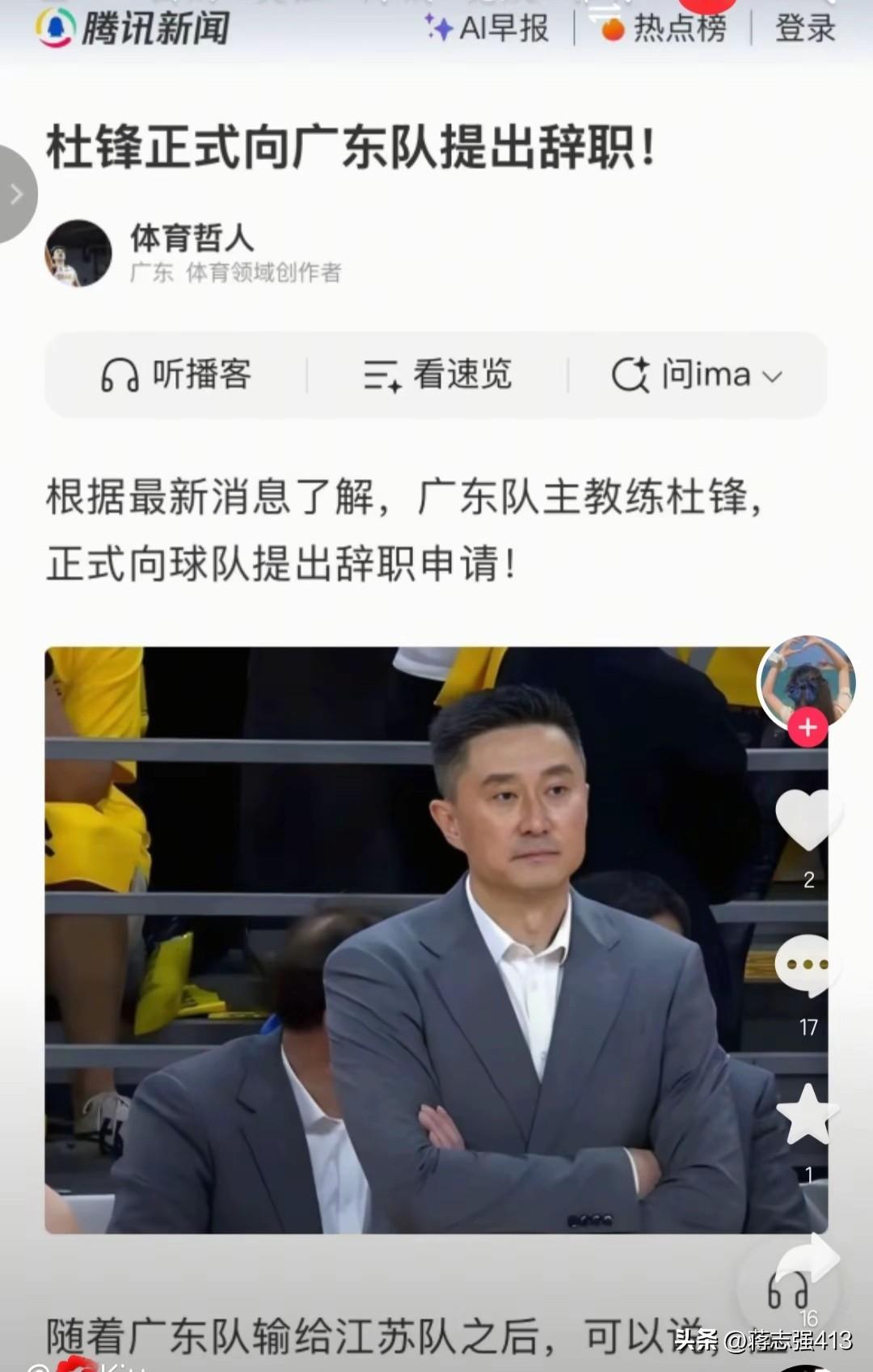 目前看广东队叫杜锋辞职肯定不明智,联赛也到了收尾阶段,现在叫杜锋辞职就等于放弃这