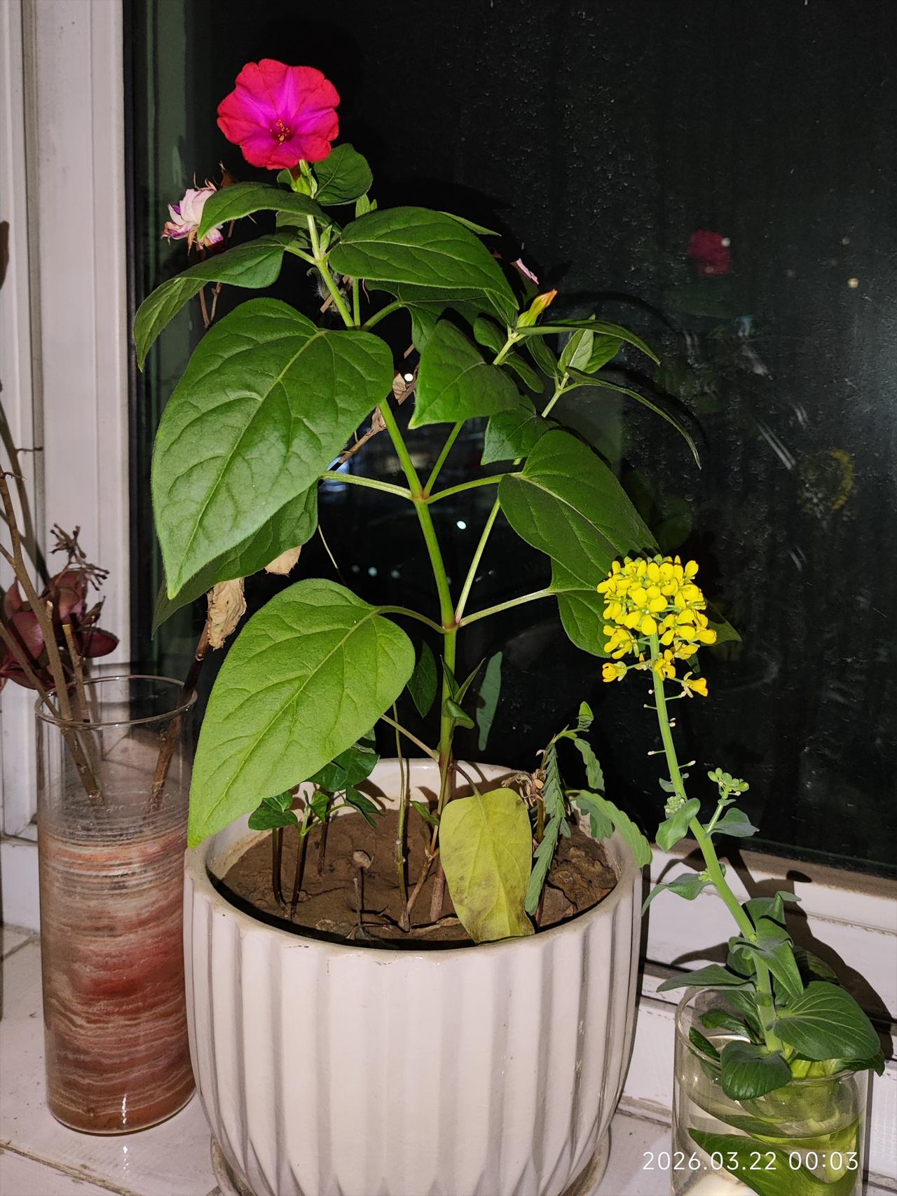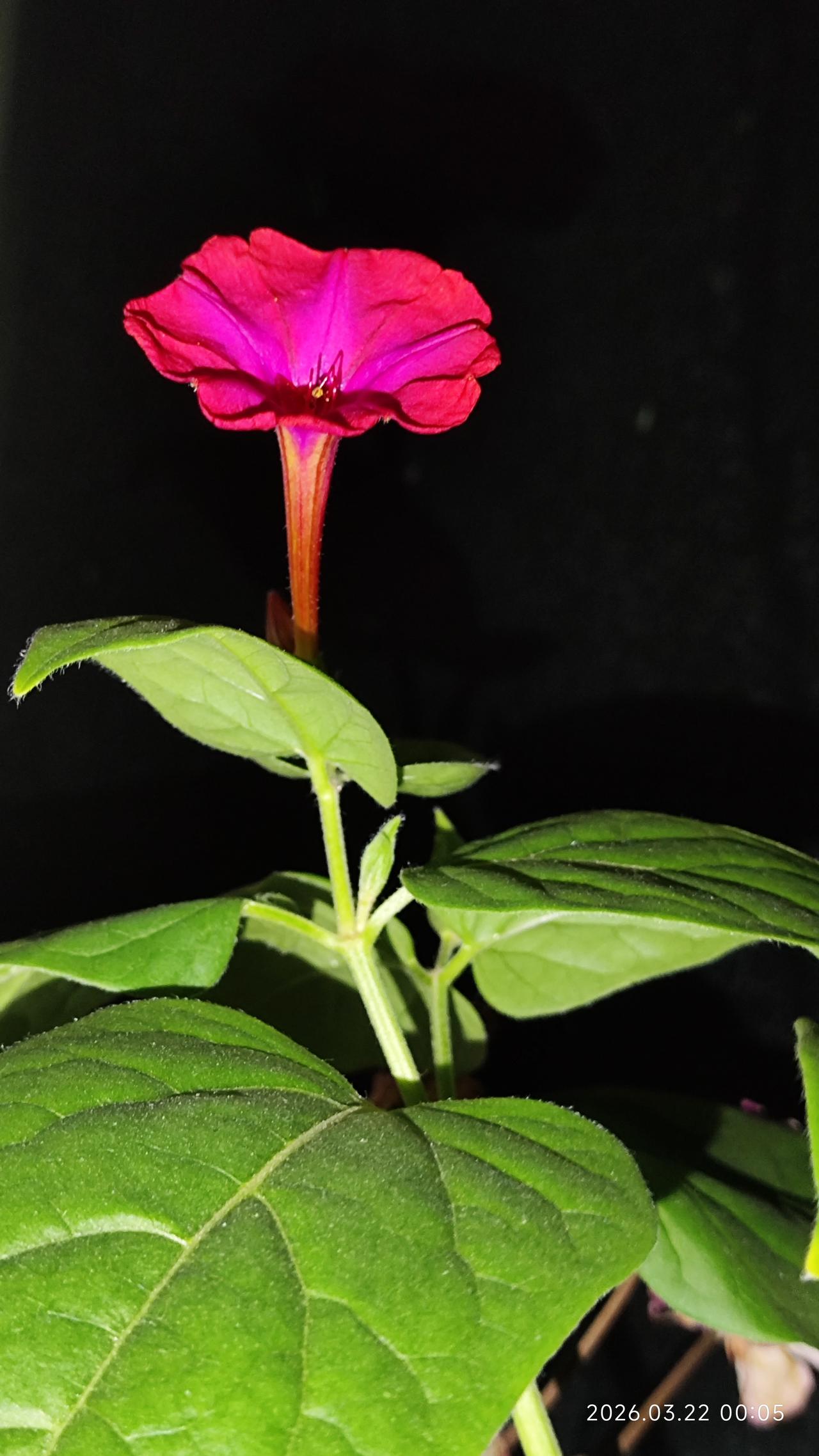 你知道这种花叫什么名字吗? 我竟然种出了一颗地雷花。 我真是个种花小能手。 小时候我就喜欢这种花,家里院子里也种过,有黄的粉的。 在我印象中,我就记得它叫小地雷,因为它的种子像一颗小地雷。 去年我去外面溜达,在墙角杂草丛中看到这种花,我就摘了几个种子,塞到了花盆里。 我经常在花盆里塞各种种子,发芽之后我也不知道是什么。 前些天这棵花不停的长叶子,当时我还不知道它是什么花。 前几天突然发现它长花苞了,然后我猜它有可能是地雷花。 昨天我无意中往阳台上一瞥,感觉眼前有点红色。 刚开始没反应过来,后来才想起来是它开花了。 刚才在豆包上查了一下,说这种花在傍晚开或者是早上。 白天的时候就收起来了。 幸亏昨天晚上我拍了照片,今天起来之后就发现它已经闭合了。 豆包说这种花叫紫茉莉,你们管这种花叫什么呢? 我真是太厉害了,从一颗种子种出了一朵花。