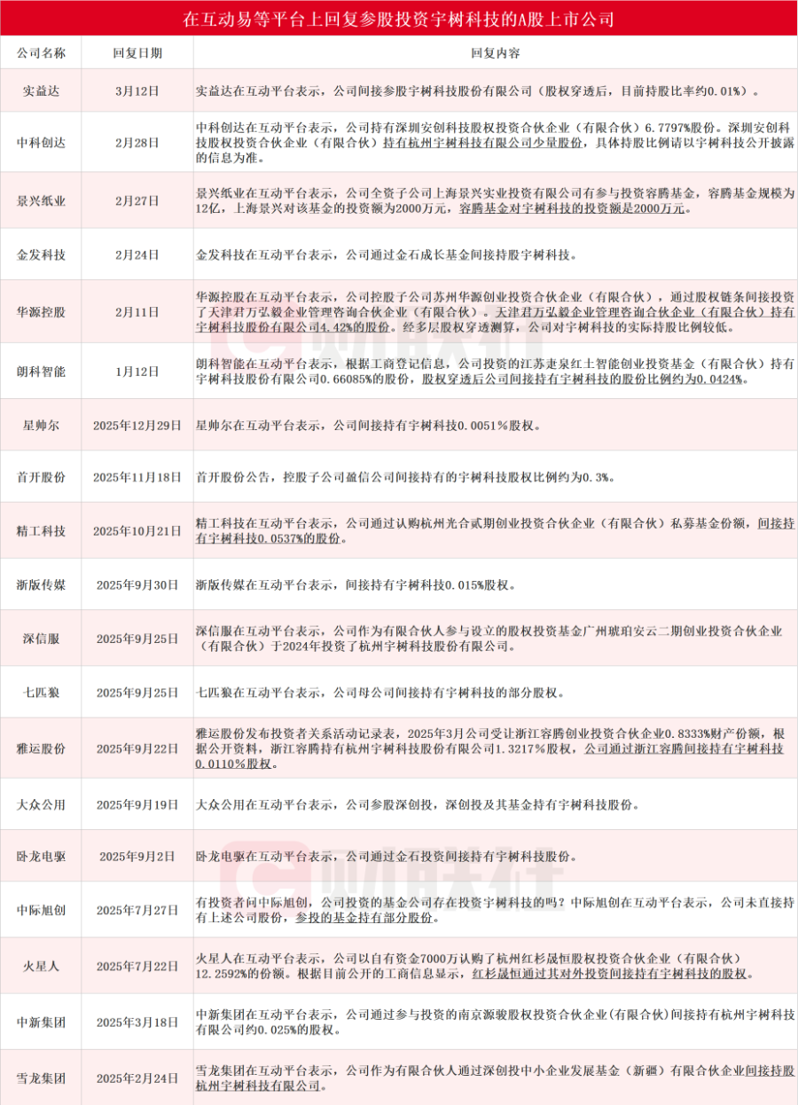 据不完全统计,实益达、中科创达、景兴纸业、金发科技、华源控股、朗科智能、星帅尔、首开股份、精工科技、浙版传媒、深信服、七匹狼、雅运股份、大众公用、卧龙电驱、中际旭创、火星人、中新集团和雪龙集团在内的19家A股上市公司在互动易等平台上回复参股投资宇树科技。实益达3月12日在互动平台表示,公司间接参股宇树科技股份有限公司。