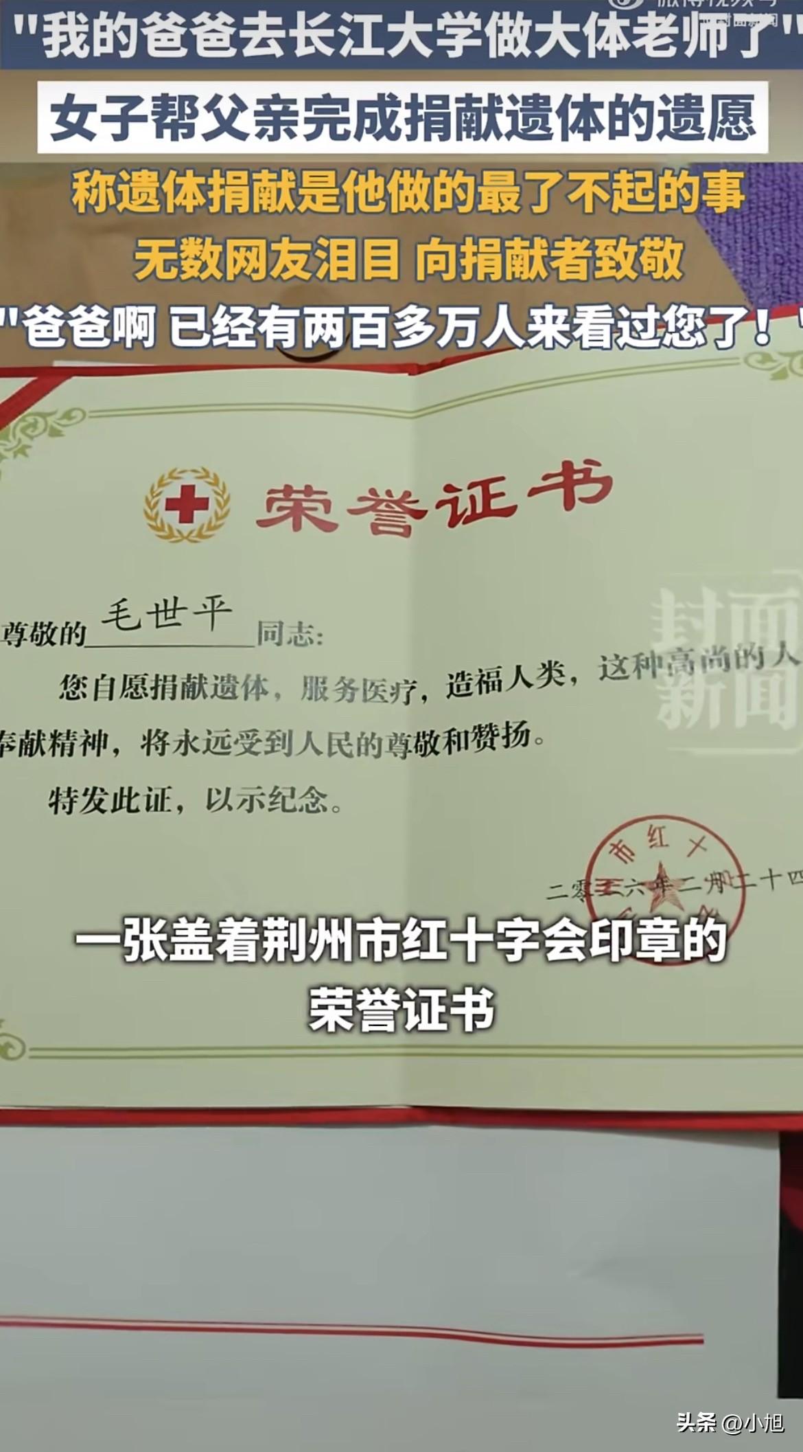 但毛女士和妈妈都知道,爸爸心里头那个最大的事是什么。第二天,她们就给荆州市红十字会打了电话。当天,工作人员就把毛世平的遗体送到了长江大学荆州校区。
