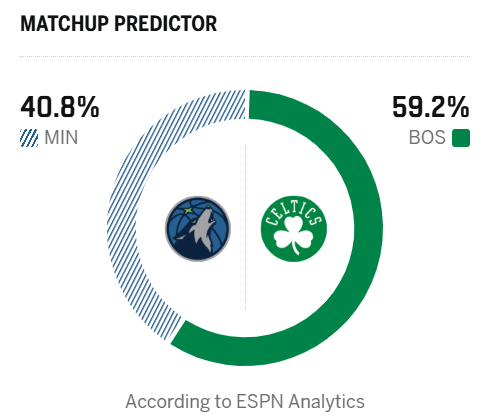 赛前,美媒ESPN预测本场比赛,凯尔特人胜率59.2%,森林狼胜率40.8%。