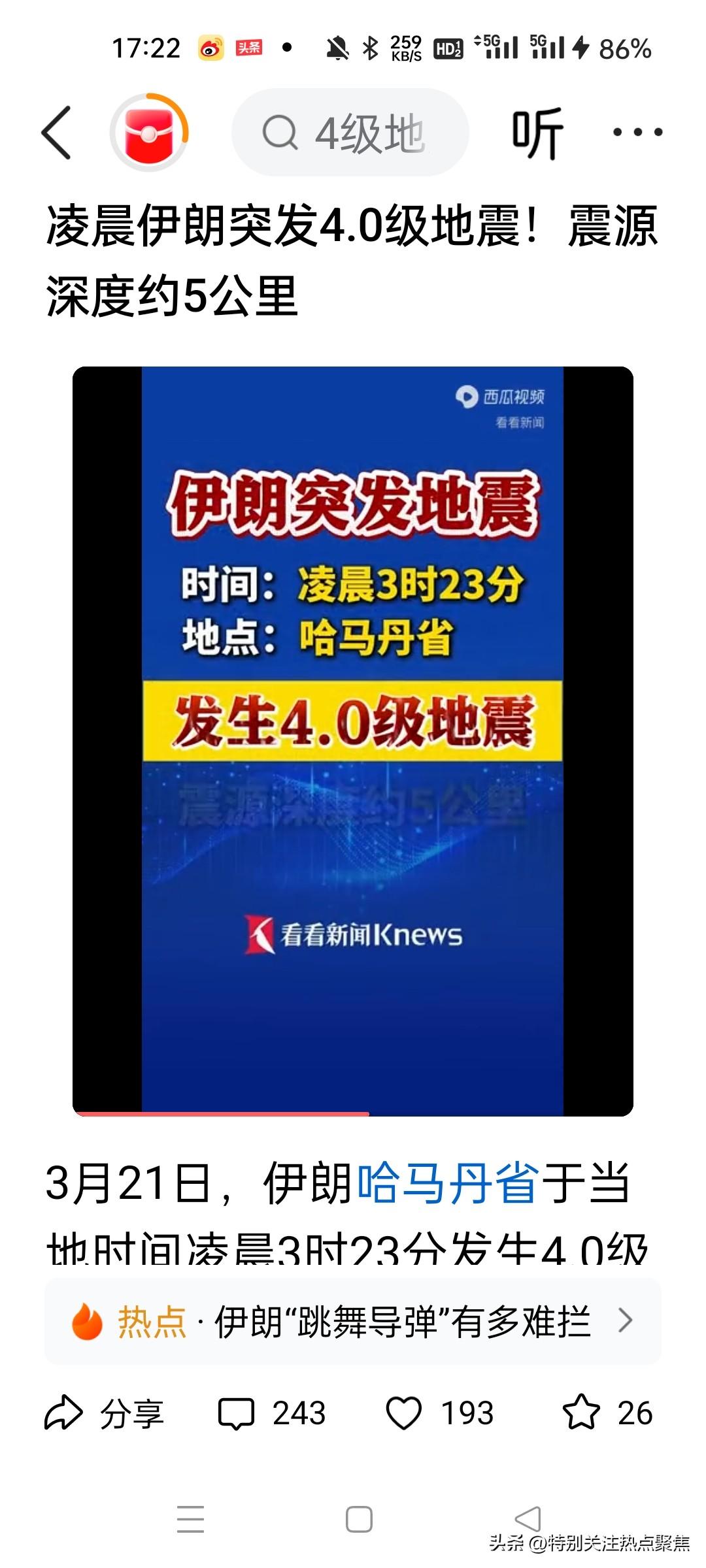 伊朗是否核试验?凌晨伊朗突发4.0级地震!震源深度约5公里 目前没有权威证据表明伊朗进行了核试验,相关地震被确认为自然地质活动。 关于您提到的“凌晨突发 4.0 级地震、震源深度约 5 公里”的情况,结合最新信息分析如下: 地震事实确认:2026 年 3 月 21 日凌晨,伊朗哈马丹省确实发生了一次 4.0 级地震,震源深度较浅(约 5-10 公里区间)。此外,3 月 20 日伊朗南部法尔斯省也发生过 4.1 级浅源地震。21920 核试验猜测缺乏依据:尽管部分观点将此类浅源地震与核试验联系起来,但科学分析指出,人类地下核试验的引爆深度通常不超过 1.5 公里,且核爆炸产生的地震波波形、能量释放模式与自然断层错动有本质区别,全球专业监测台网可精准区分。20 官方与权威定性:伊朗官方已将近期地震定性为自然现象,国际主流地震监测机构未发布任何异常预警或核爆信号。地质专家指出,伊朗地处阿拉伯板块与欧亚板块碰撞带,是全球浅源地震高发区,此类震级和深度的天然地震非常频繁。320 结论:所谓“伊朗核试验成功”的说法目前仅为网络推测和地缘政治博弈下的过度解读。 风险提示:在地缘局势紧张时期,自然灾害常被误读为军事信号。请以各国地震局、国际原子能机构(IAEA)等权威部门发布的信息为准,警惕未经证实的谣言传播。