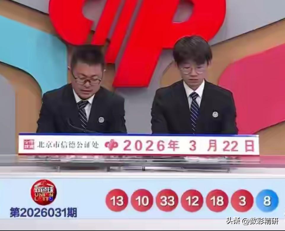双色球第26031期开奖号码新鲜出炉:红球03、10、12、13、18、33,蓝球08。 本期红球看点颇多——重号10再度现身,连号12与13携手亮相,斜连码12、13及18齐齐登场,同尾码03、13、33亦成一组巧思。奇偶比为3:3,三区分布维持2:3:1,与上期如出一辙。蓝球则稳稳开出08。 整体来看,本期号码难度中等,预计大奖井喷在望。笔者此前预测文中便提醒关注斜连码与连号,并提示留意尾数为3、6、9的号码,蓝球倾向偶数,如今看来方向无误,只是具体数字稍有偏差。路漫漫其修远兮,吾将上下而求索,期待下期斩获6+1!不知各位彩友今夜收获几何?