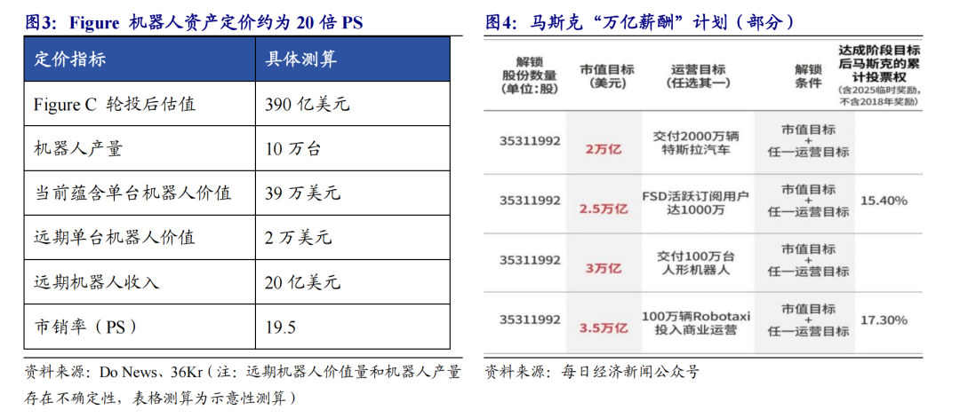 对标特斯拉、Figure等全球头部人形机器人企业,其估值定价更多锚定于“AI+机器人平台”的长期想象空间,普遍采用较高PS倍数进行定价。我们测算,量产规模下公允估值约为20倍PS,在一定程度上打开了机器人整机厂的估值天花板。2025年9月,Figure宣布完成C轮融资,投后估值攀升至390亿美元。按其量产10万台机器人计算,若单台价值量随规模化量产下探到2万美金,对应PS约20倍。此前特斯拉宣布为马斯克设计10年期薪酬计划,其中机器人Optimus目标是累计交付100万台,对应5000亿美元的目标市值。按远期单台2.5万美元售价测算,特斯拉机器人业务定价在20倍PS,与Figure估值水平相吻合。