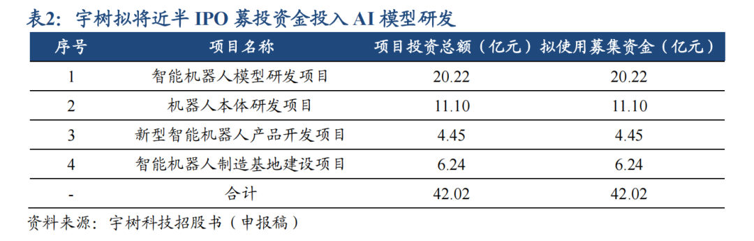 近半IPO募集资金将用于智能机器人模型研发。据宇树科技招股书,公司拟募集资金42.02亿元,分别用于智能机器人模型研发项目、机器人本体研发项目、新型智能机器人产品开发项目、智能机器人制造基地建设项目等。其中智能机器人模型研发项目拟投入20.22亿元,约占IPO募集资金的48%。