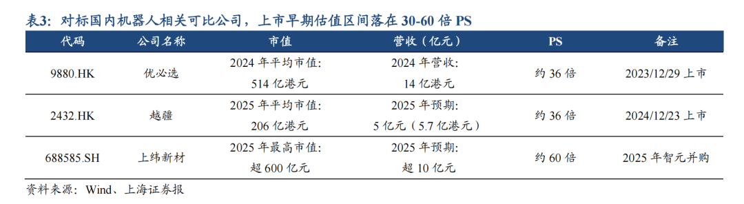 考虑可比的机器人上市公司暂未实现盈利,我们采用PS估值。对标国内机器人相关可比公司,上市早期估值区间落在30-60倍PS。