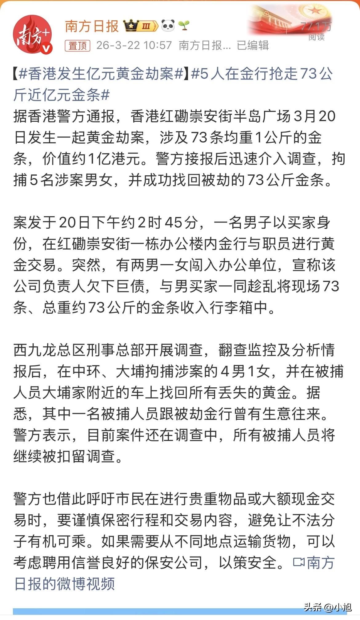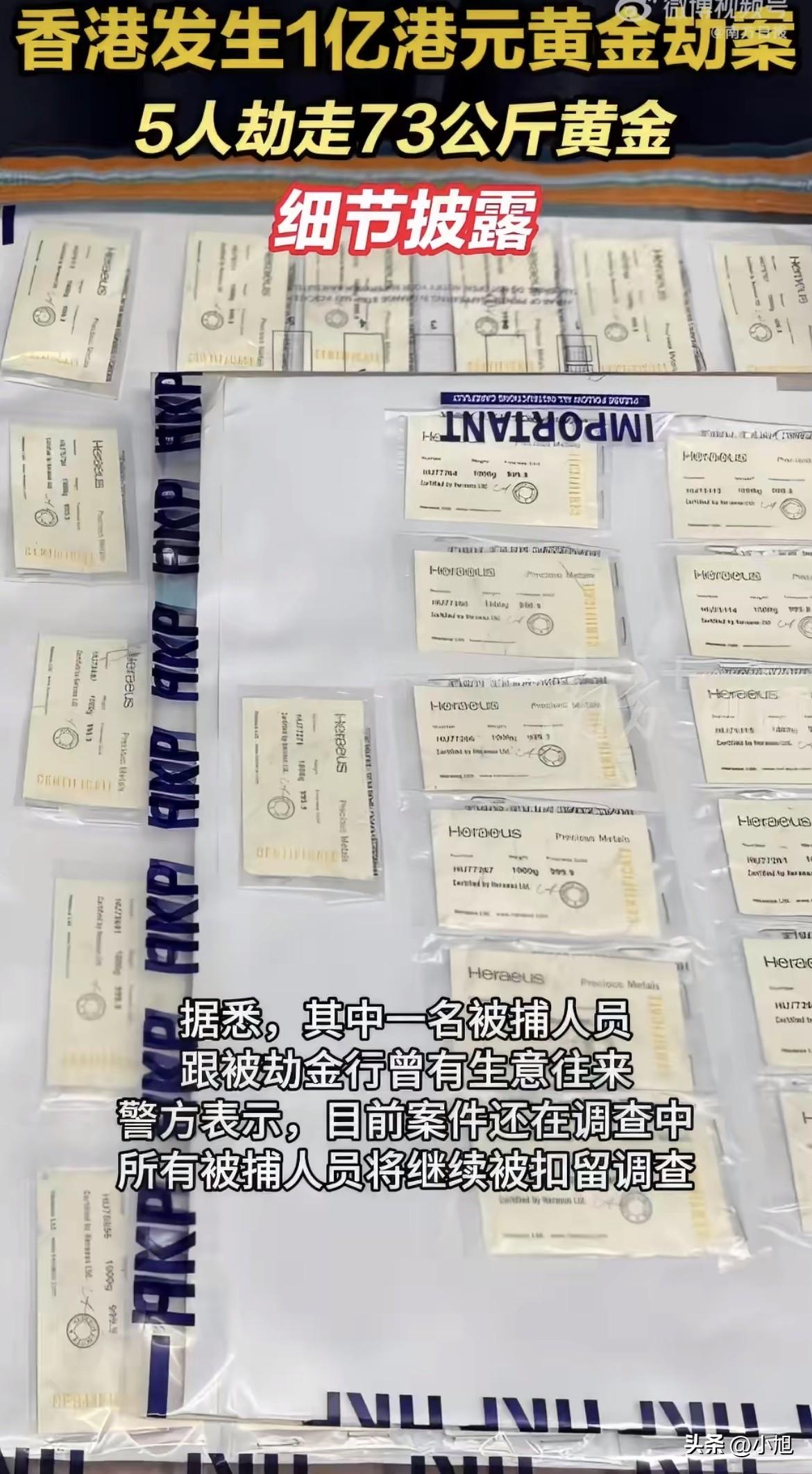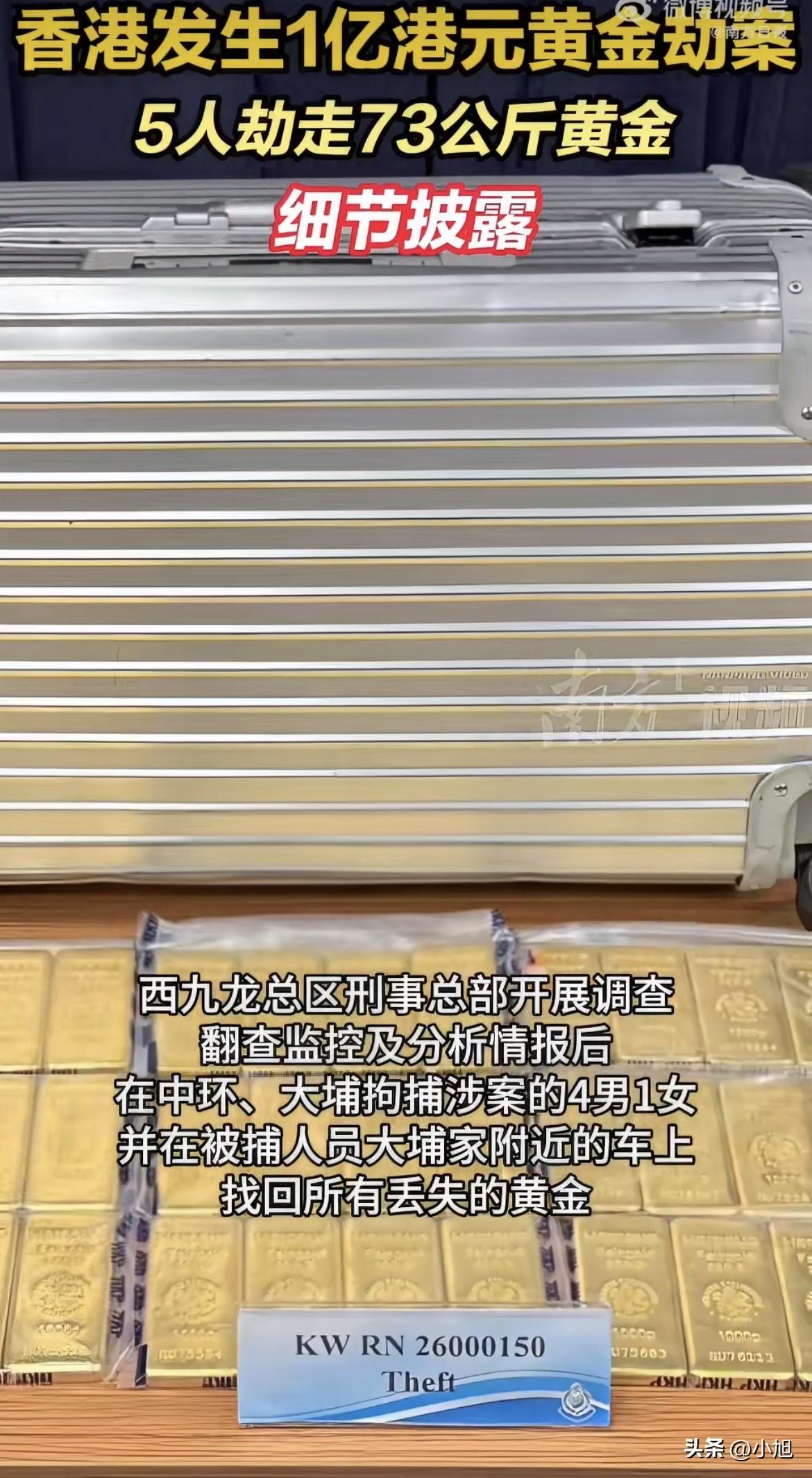 中环抓了几个,大埔抓了几个,五个人全落网。金条就在大埔一个嫌疑人住家附近的车上,行李箱都没换,原封不动找回来了。