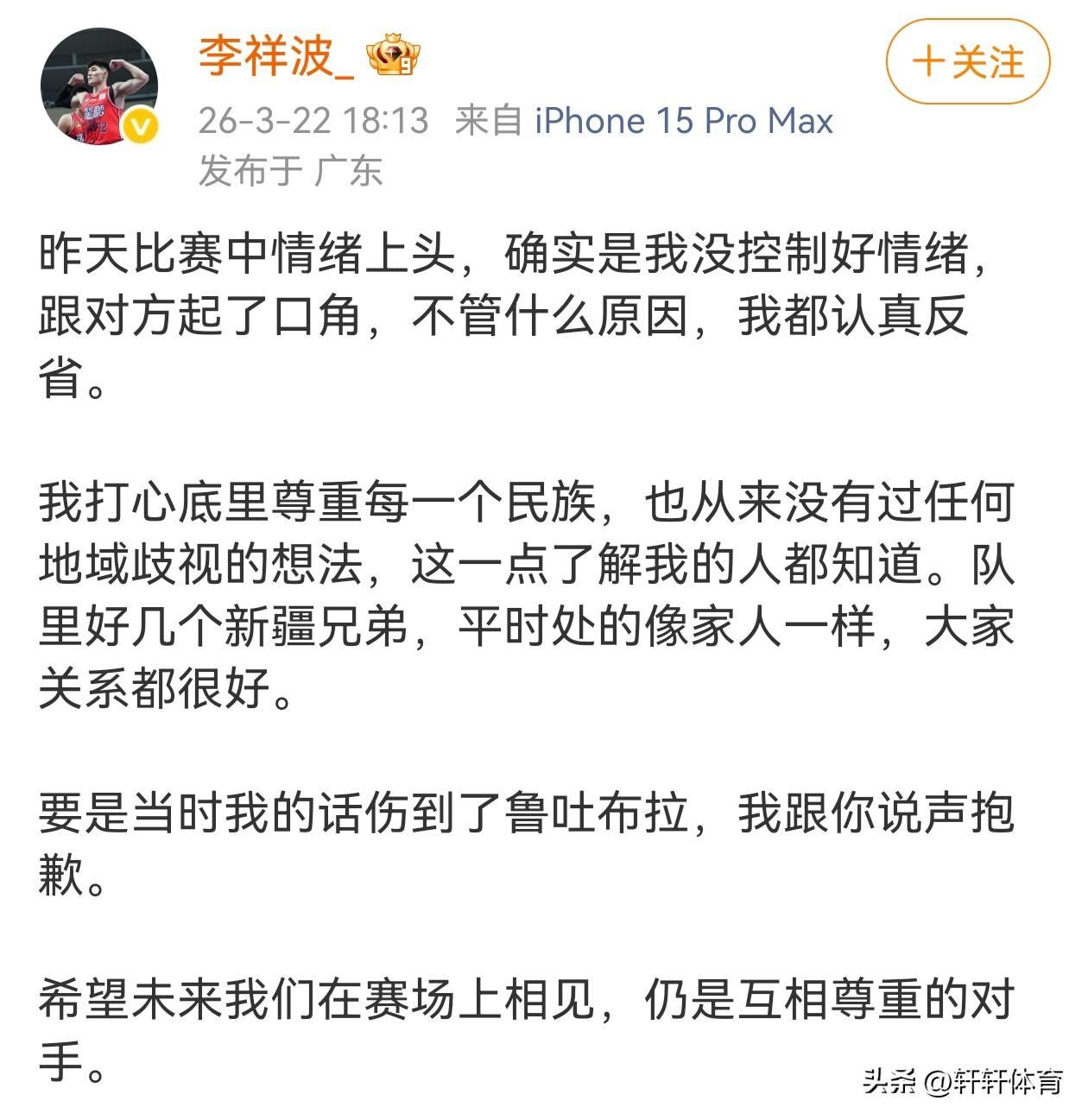李祥波道歉了,也承认比赛中情绪上头,也许李祥波并非有意的,去说出伤害鲁吐布拉的话,但是只要你说了那就要认错,56个民族都是一家人,用西热力江指导的话就是,你可以语言有冲突,甚至你都可以发生肢体冲突,但是不要说民族歧视的话,也许你当一句玩笑话,但是作为当事人可能无法接受,今天李祥波道歉了,无论是迫于外界压力还是真心认识到了自己的错误,真心希望不要再出现这种影响团结的事情发生了,借用鲁吐布拉赛后的话56个民族是一家,公道自在人心,相信这件事情CBA公司后续还会给相关人员以及俱乐部相应的处罚。