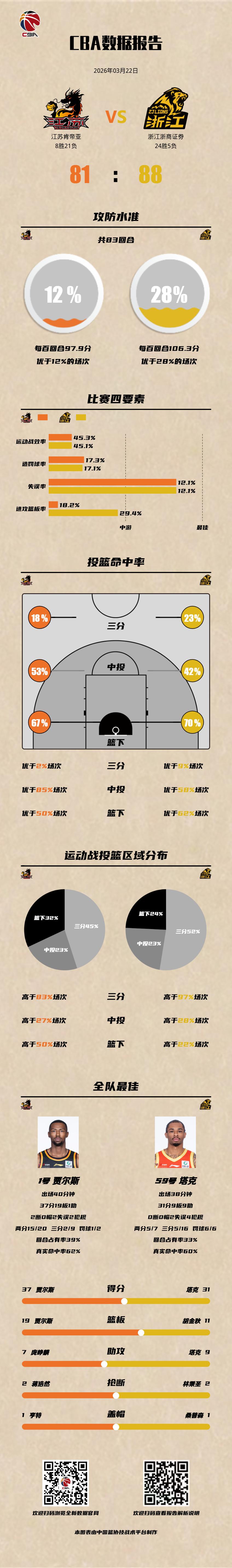 江苏肯帝亚 81-88 浙江浙商证券 江苏男篮vs广厦男篮 江苏肯帝亚:贾尔斯37分19篮板2抢断,庞峥麟15分3篮板7助攻,亨特10分6篮板5助攻; 浙江浙商证券:塔克31分9篮板9助攻,桑普森17分10篮板,胡金秋16分11篮板。
