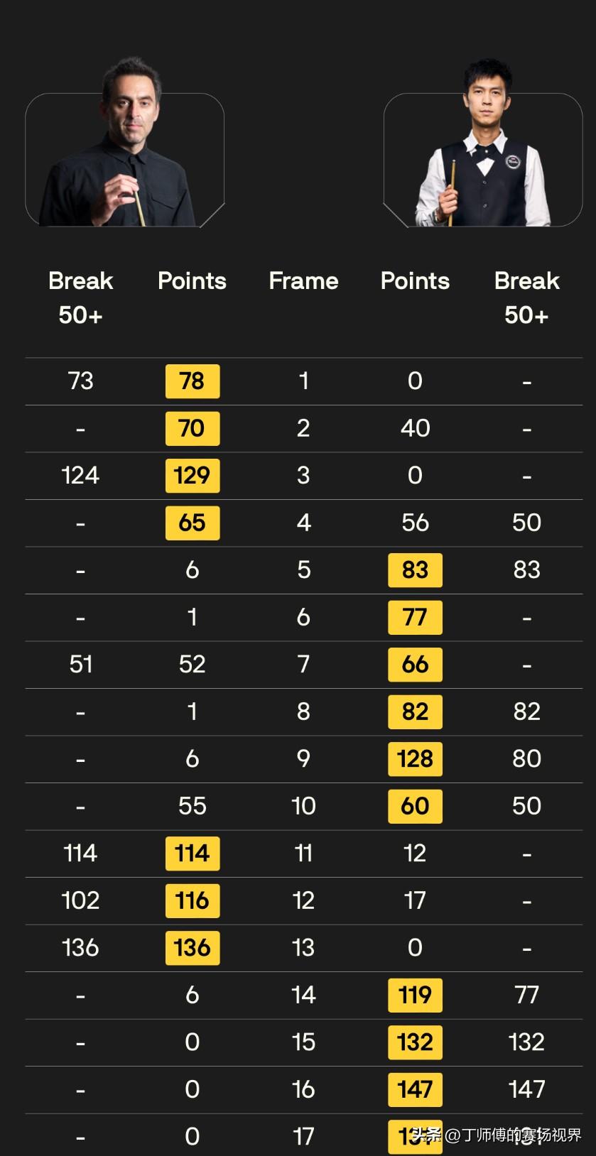 世界公开赛决赛堪称神仙打架! 塔猜亚和奥沙利文上演了一场令人难以置信的比赛,塔猜亚连赢五局结束第一阶段后,第二阶段再赢一局,以6-4拉开差距。 随后奥沙利文连续打出单杆114、102、136分连赢3局。然而接下来的4局变成塔猜亚个人表演时间,回敬了奥沙利文三杆破百之余,他在第16局甚至打出了个人第七个满分杆147分,最终以10-7的比分赢得了2026年世界公开赛冠军,赢得了17.5万英镑的奖金以及巡回锦标赛的参赛资格。 世界公开赛决赛最后七局两人合计打出6杆破百,估计是本赛季最精彩的决赛没有之一!这是塔猜亚职业生涯第二座排名赛冠军,也是他人生中最大的胜利!