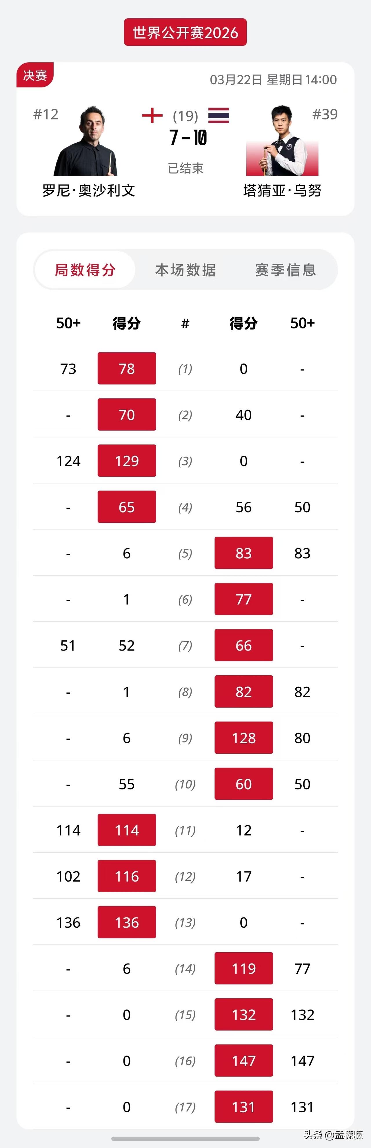 七年蛰伏,一朝亮剑 以黑马之姿,斩冠军荣耀 泰国黑马塔猜亚·乌努一黑到底!在2026斯诺克世界公开赛决赛,他简直是上演了一场绝地反击的大戏。 比赛开始,奥沙利文火力全开,4 - 0打得塔猜亚有点懵。但塔猜亚没放弃,迅速调整,连赢五局反超。 第二阶段奥沙利文又反超,可塔猜亚彻底打疯了。决赛中轰出职业生涯第7杆147满分杆,太炸裂了!最终10 - 7击败奥沙利文夺冠。 这可是他职业生涯第二座排名赛冠军,打破7年冠军荒。还直接跻身单赛季奖金榜前12,锁定巡回锦标赛资格。蛰伏七年,一朝爆发,塔猜亚这黑马杀得漂亮!