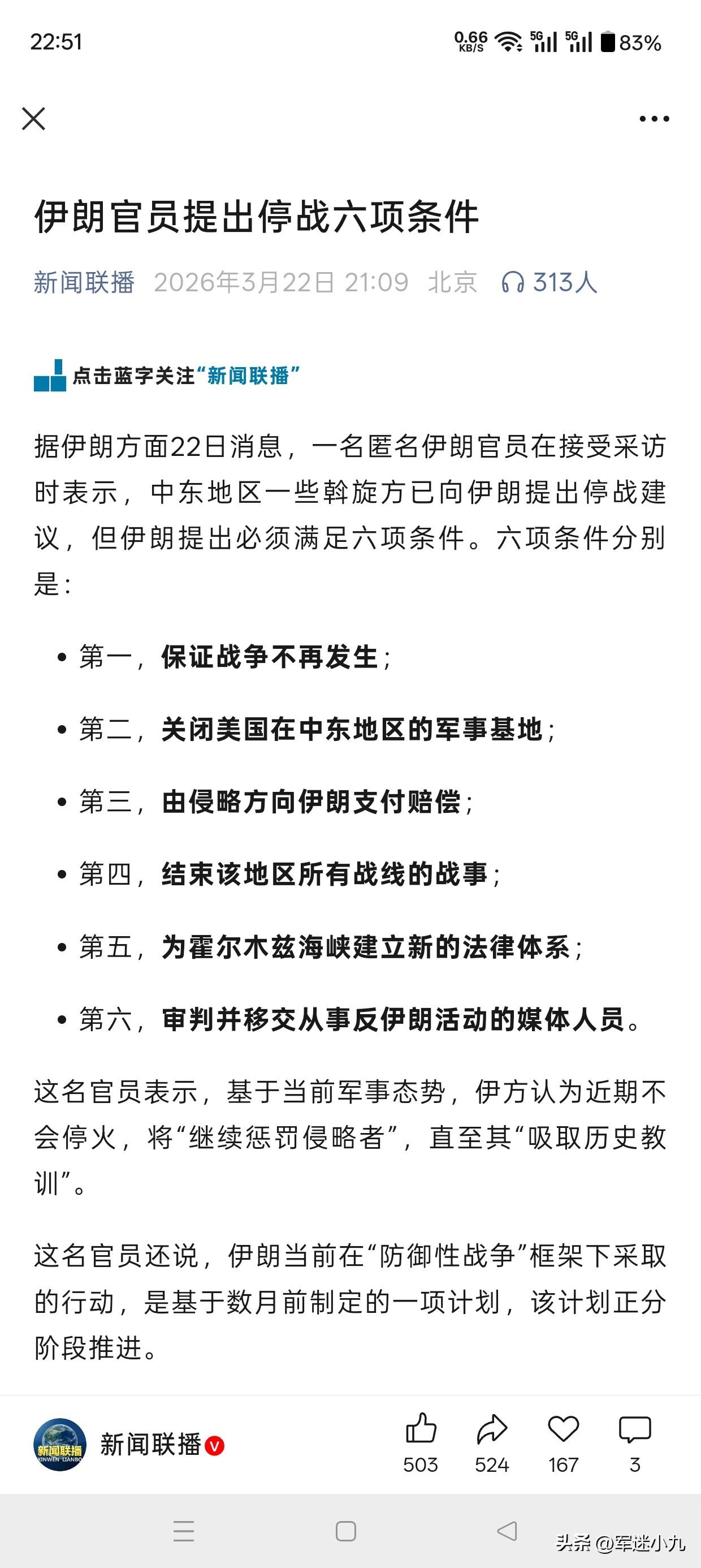 美伊各自表态,战争停火的条件,感觉就像是在闹着玩一样…… 最新的伊朗方面提出的停战条件, 一共6条,看似都很合理, 但是每一条想要达成都不太可能, 更别说,6条同时满足了! 1.美国保证不了,它自己说的, 都不算数,根本没有信誉可言, 加沙战事,已经说明了这一点! 2.这更不可能,让老美在中东失去 军事存在,无异于要它命! 3.赔钱,更是做梦,它自己都没钱呢, 让老美给你赔钱,想的有点美! 4.这个更保证不了,所有战事停止! 5.战争已经证明,法律体系没用, 人家压根也不遵守承诺和国际法! 6.这一条,倒是有点可能会实现! 再看,老美这边提出的要求,看着更是咄咄逼人,更没有可能实现,导弹不让发展了,现有导弹不让用了,抵抗组织也不让资助了,都答应完了,然后,以色列,接着打击伊朗,一下,就又回到原点了! 大家觉得呢? 评论区说说你的看法!
