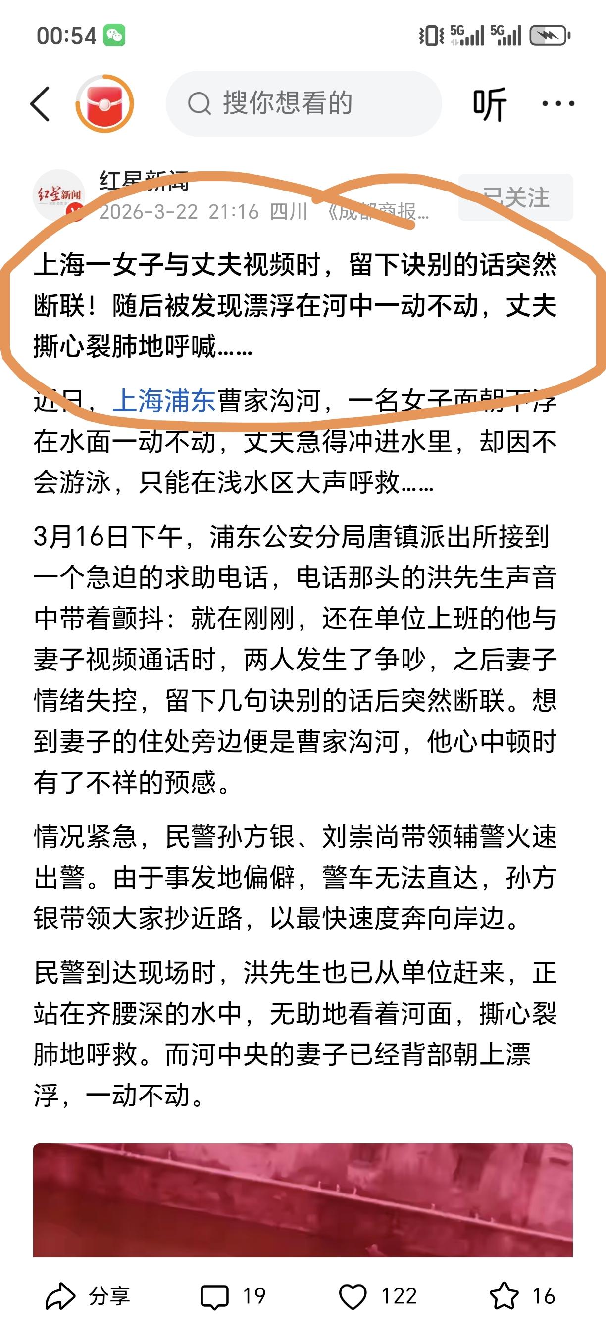 人啊,得多么绝望才会走向这一步啊。 女子和丈夫视频吵架,留下几句诀别话后突然断联,最后被发现漂浮在曹家沟河中央,丈夫不会游泳,只能站在齐腰深的水里,撕心裂肺地喊她的名字…… 那些在婚姻里没被接住的委屈、没被看见的疲惫、没被安抚的崩溃,攒了又攒,最后变成了压垮她的最后一根稻草。 人这一辈子,真的没有过不去的坎啊。 哪怕吵到天翻地覆, 哪怕觉得眼前一片漆黑, 也请再给自己一次机会: 去吹吹晚风,去吃一顿热乎的饭,去跟朋友骂个痛快,怎么都好,别选那条再也回不了头的路。 愿每个在黑暗里挣扎的人, 都能被温柔接住; 愿每段关系里, 都有人愿意看见你的眼泪, 接住你的崩溃。