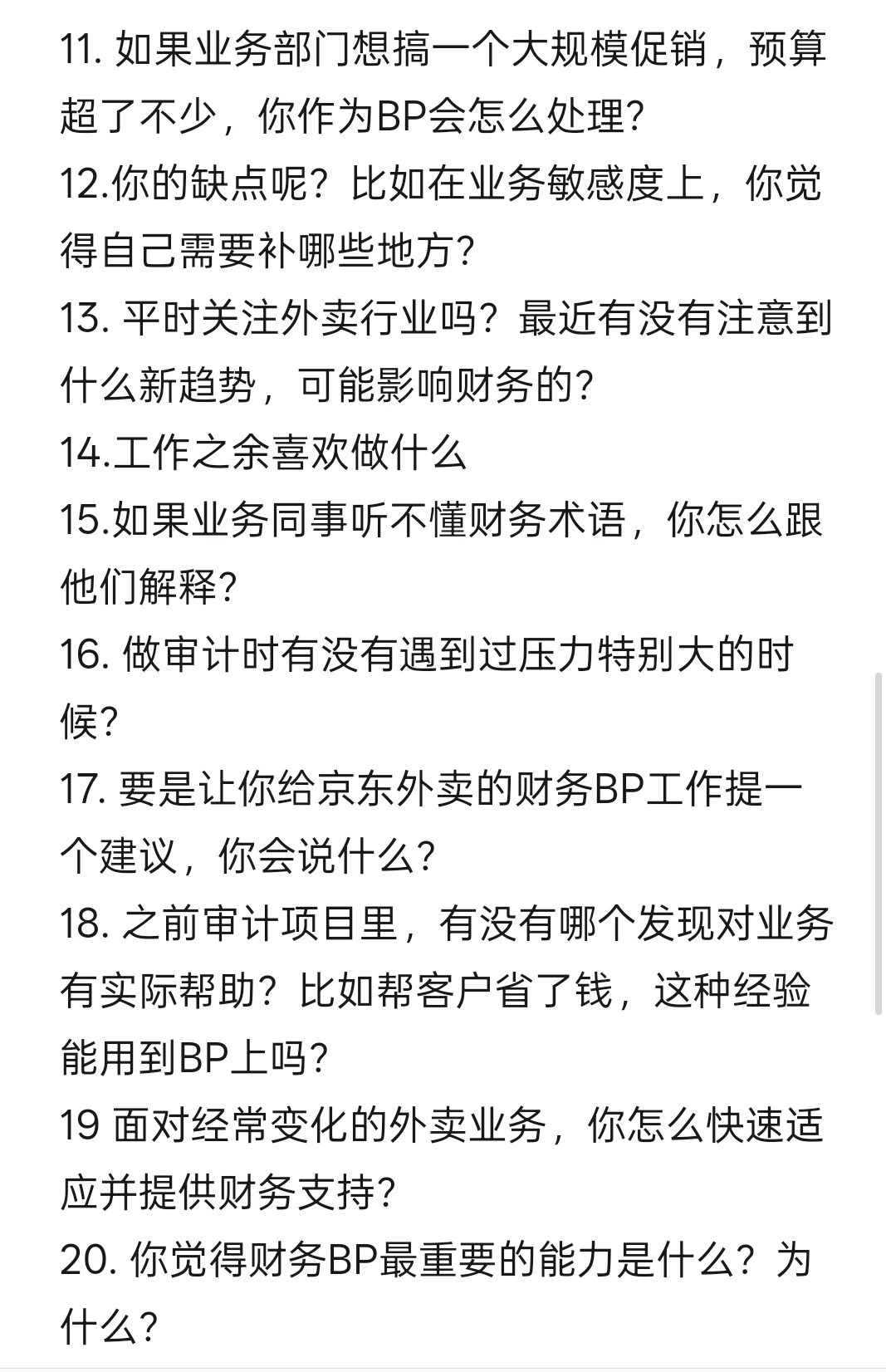 17. 要是让你给京东外卖的财务BP工作提一个建议,你会说什么?