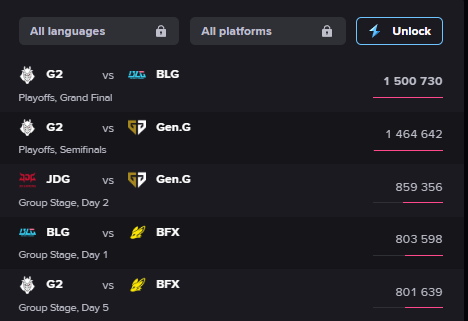G2对战GEN的半决赛,峰值也达到了1,464,642,也超过去年先锋赛决赛。