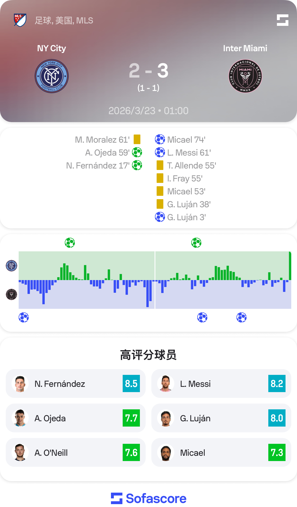 这夜熬的值~梅西任意球破门,又一场跌宕起伏的客场逆转之旅!凭借卢汉、梅西、米凯尔的进球,迈阿密国际客场3比2逆转战胜纽约城,顺利带走三分!