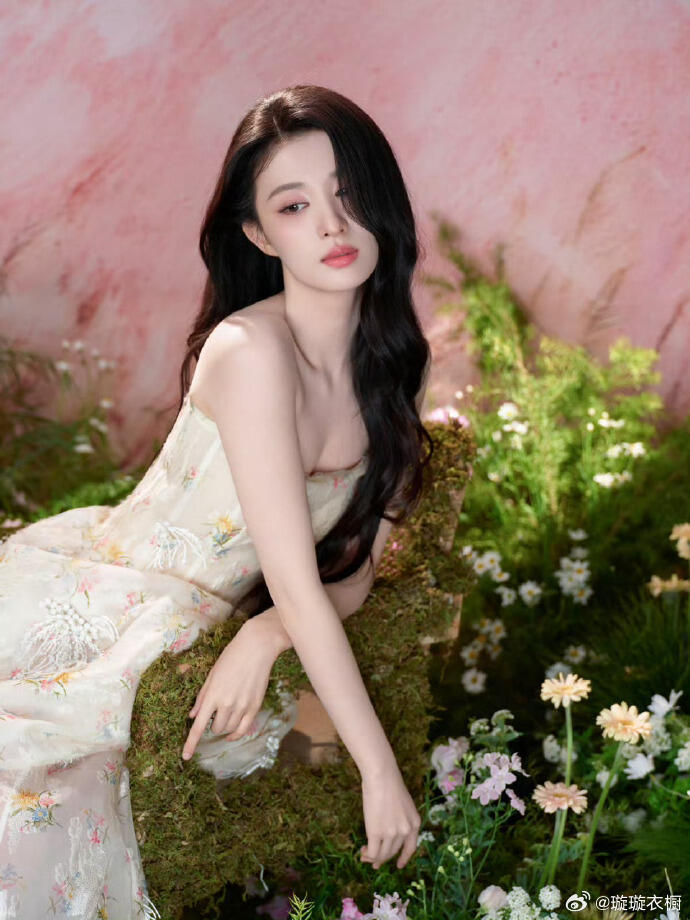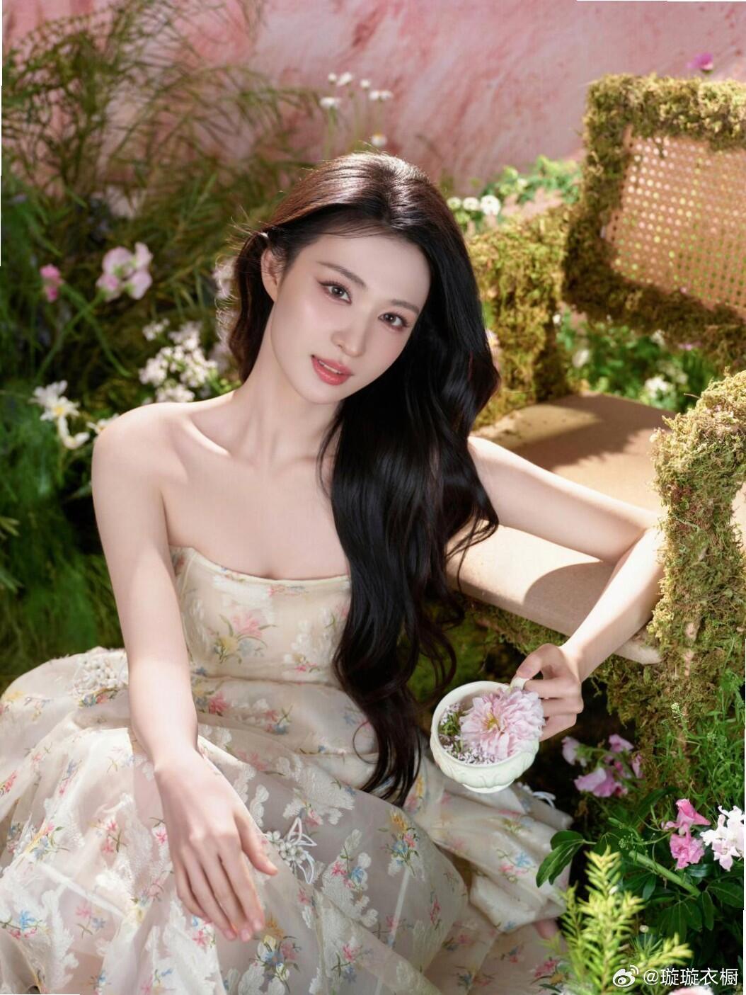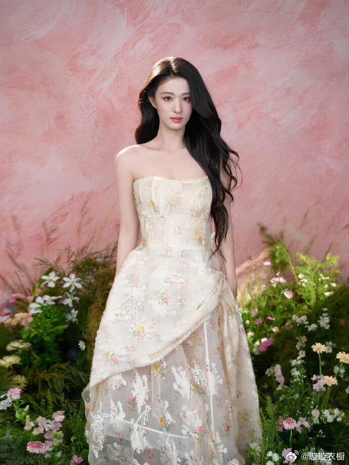 春日花境中,王楚然身着抹胸碎花纱裙,将东方典雅与迪奥高级感演绎得淋漓尽致。