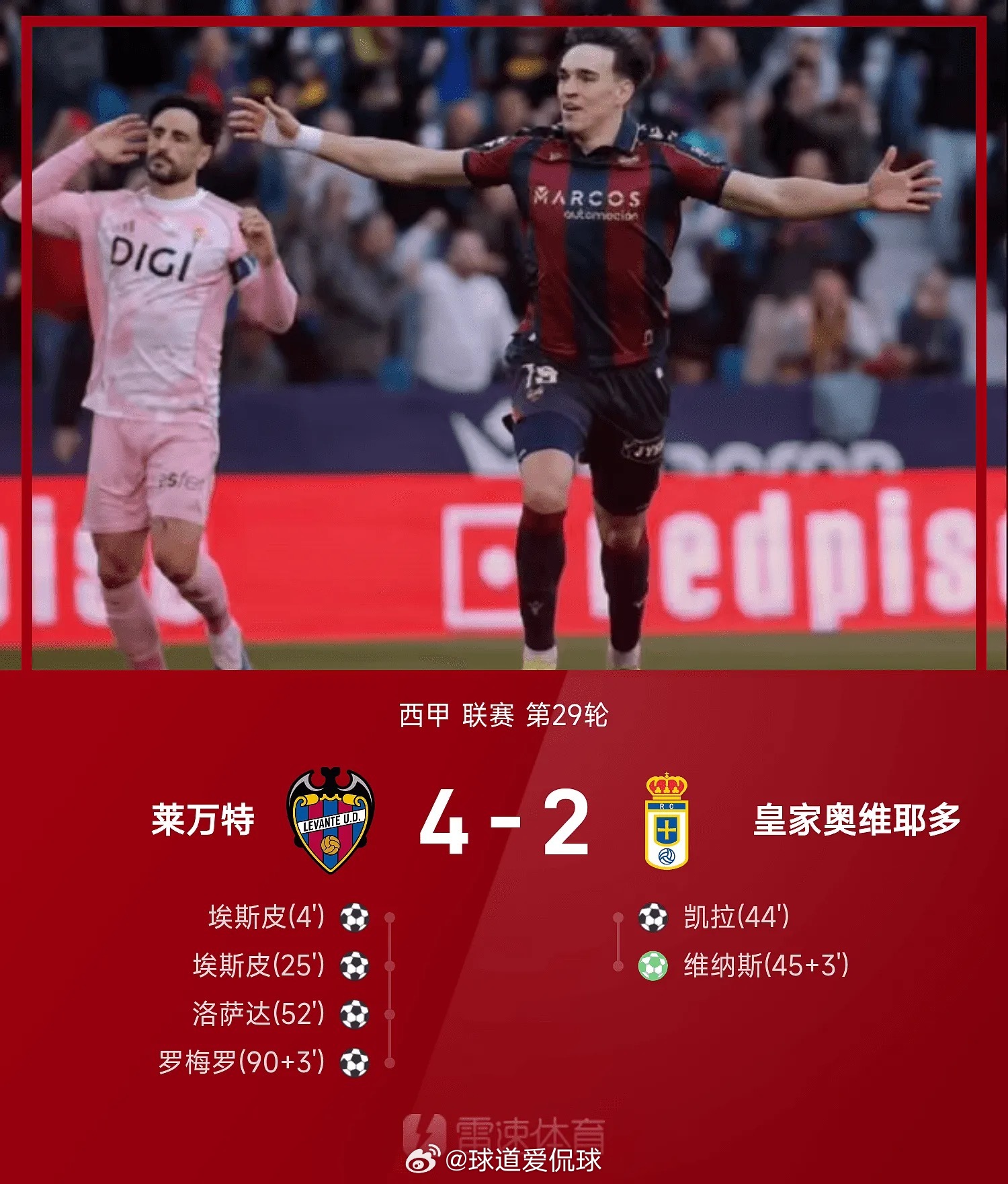 03月22日讯 25/26赛季西甲联赛第29轮,莱万特主场以4-2轻取皇家奥维耶多。上半时比赛,埃斯皮贡献双响,助莱万特早早取得2球优势,但接下来的比赛风云突变,凯拉和维纳斯连进2球,帮助奥维耶多在半场结束前扳平,下半时比赛,洛萨达和罗梅罗分别再进一球,助莱万特锁定场上胜局。足球体育西甲西甲联赛