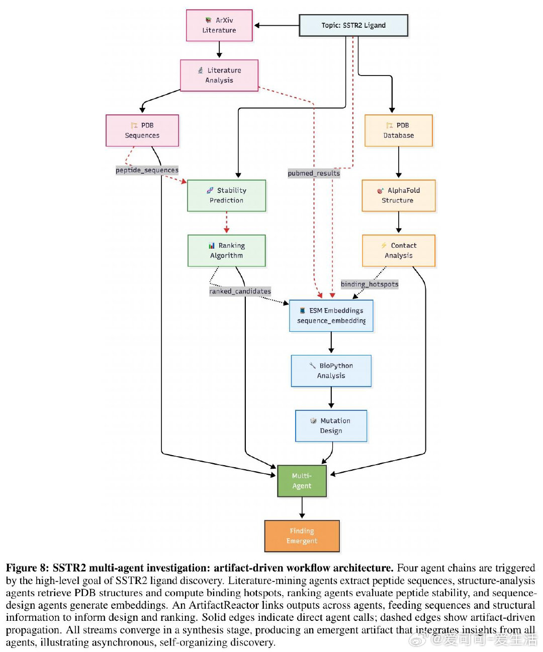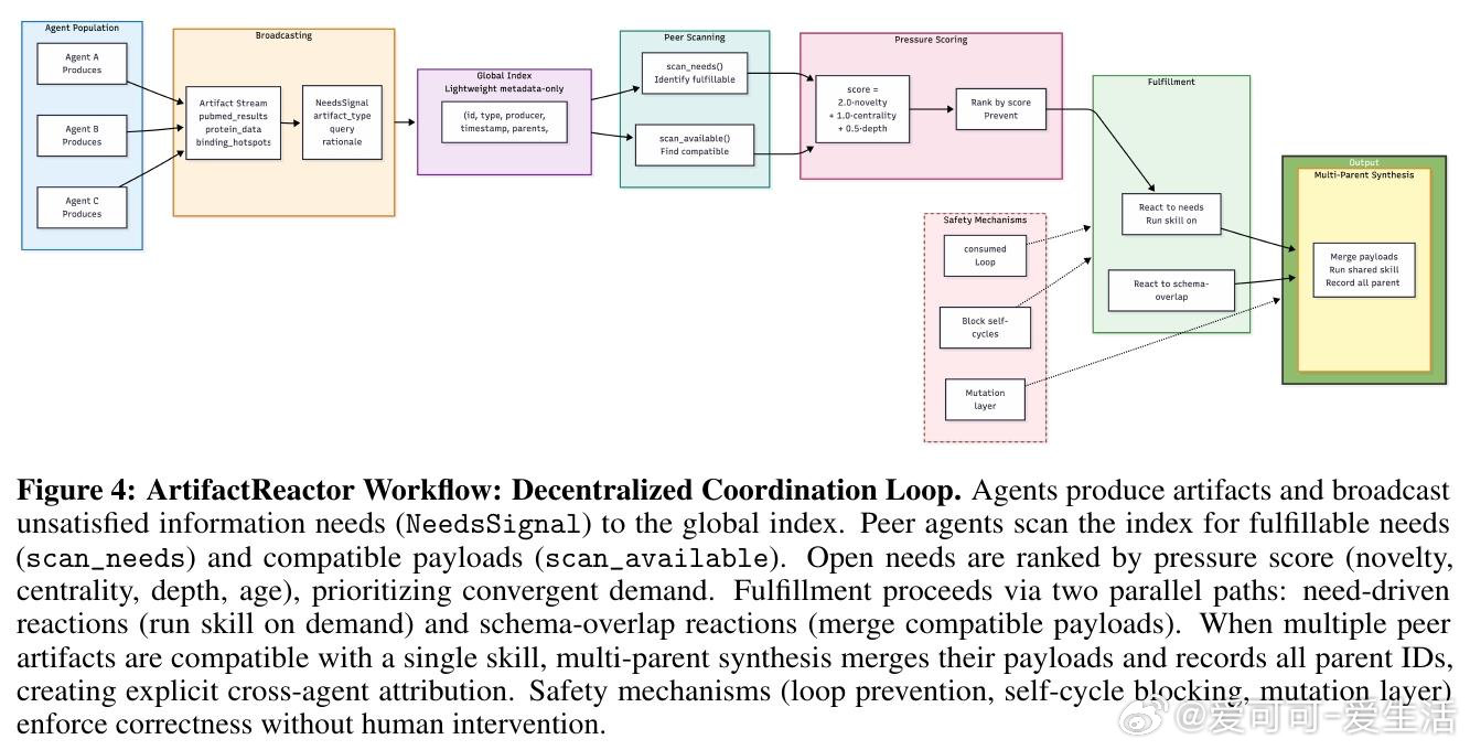 本文的核心洞见是:把"智能体间协调"重新看作一种基于工件压力的生态涌现,而非任务分配问题。由此,ArtifactReactor这一关键机制使问题得以解开——智能体将未满足的信息需求广播至共享索引,同伴根据压力评分自主响应;当多个工件模式重叠时,自动触发多父节点合成,整个协作过程无需预先编排,推理路径全程可通过有向无环图追溯至原始计算。
