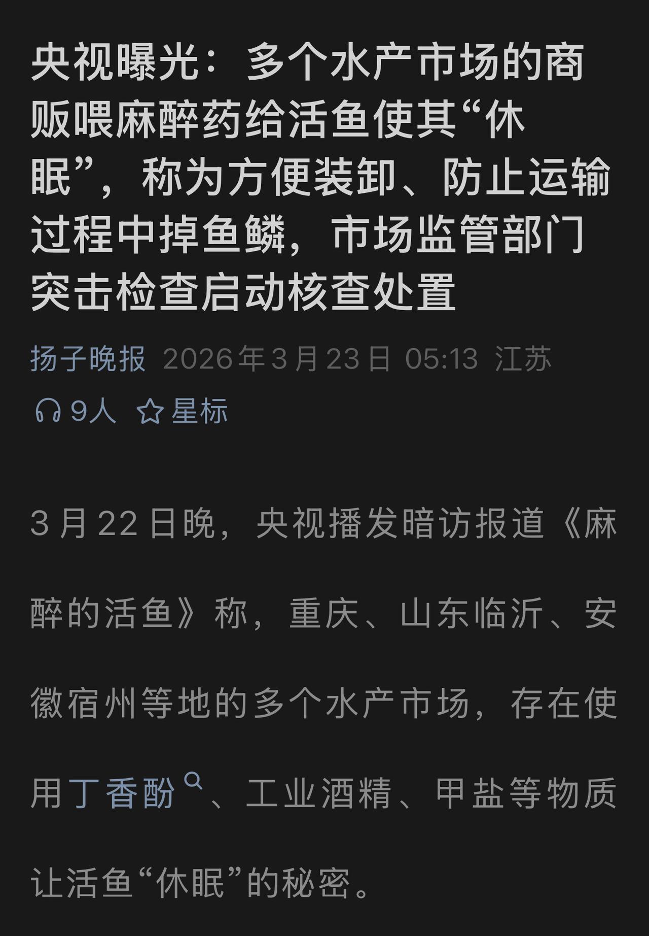 突发!央视曝光多个黑心商家,和每个人息息相关,大家去市场一定要警惕防范! 3月22日,央视曝光重庆、山东临沂、安徽宿州等地多个水产市场,存在使用有害物质给鱼催眠麻醉的行为,原因仅仅是因为鱼儿太活跃,为了方便装卸! 目前国家质量检测部门已经奔赴各地检查! 食品安全大于天,食品质量检测需要媒体监督检测,市场质量监督部门,那么多人为何发现不了问题呢? 给鱼喂麻醉药,第一次听!水产品市场竟然有这样的事情!