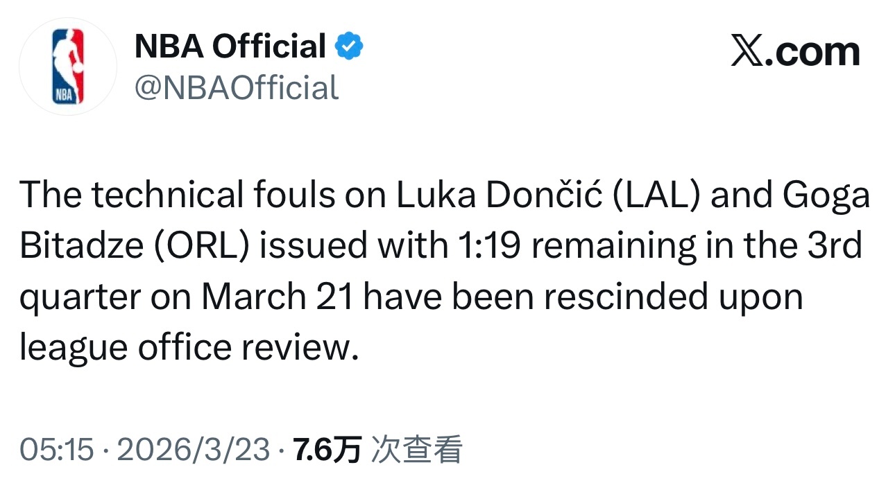 经过联盟裁判办公室的审查,撤销了东契奇昨天吃到的本赛季第16次技术犯规,因此他可