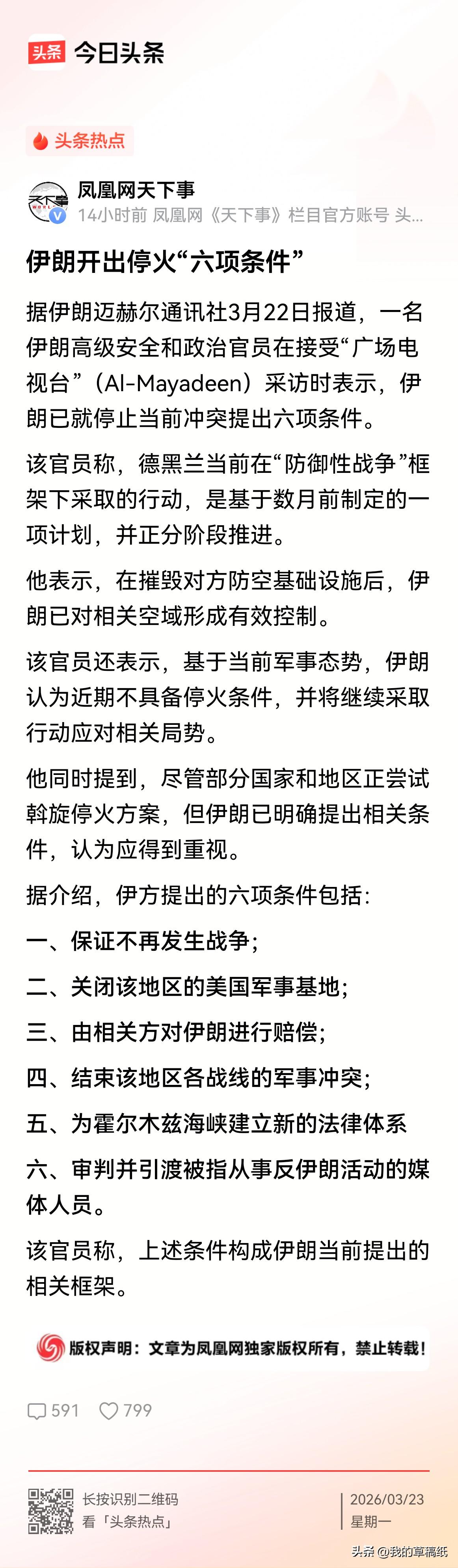 彻底谈崩!伊朗抛6项停火条件,美国直接狮子大开口,霍尔木兹海峡要封了! 敢信吗?美伊刚谈停火,两边条件一摆,直接谈不下去了! 伊朗先放出停火六项条件: 保证不再开战、关闭美军中东基地、赔偿损失、结束地区战事、规范霍尔木兹海峡、严惩反伊媒体。 结果美国反手就提苛刻要求: 伊朗5年不准搞导弹,彻底停止铀浓缩,完全 surrender 才有的谈。 更炸的还在后面! 特朗普放话:要袭击伊朗发电站。 伊朗直接硬刚: 敢炸电厂,我立刻全面关闭霍尔木兹海峡,同时打击以方能源设施、清除中东美资企业、瞄准所有美军基地国电厂。 一个要彻底阉割对手,一个拿全球能源命脉当底牌。 这哪是谈判,分明是在战争边缘疯狂试探。 你觉得美伊还会继续打,还是最后各退一步?评论区大胆说!