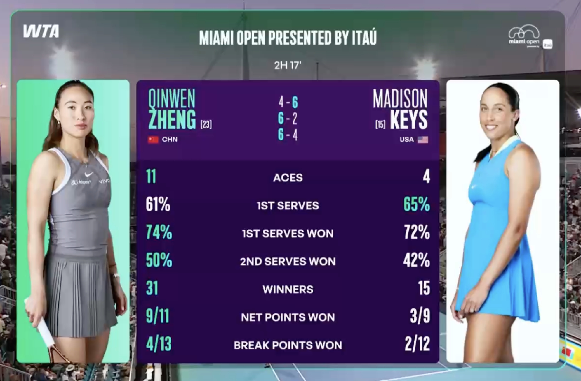 技术统计:郑钦文31记制胜分,11记Ace,上网得分率9/11,挽救10个破发点,一发进球率61%!