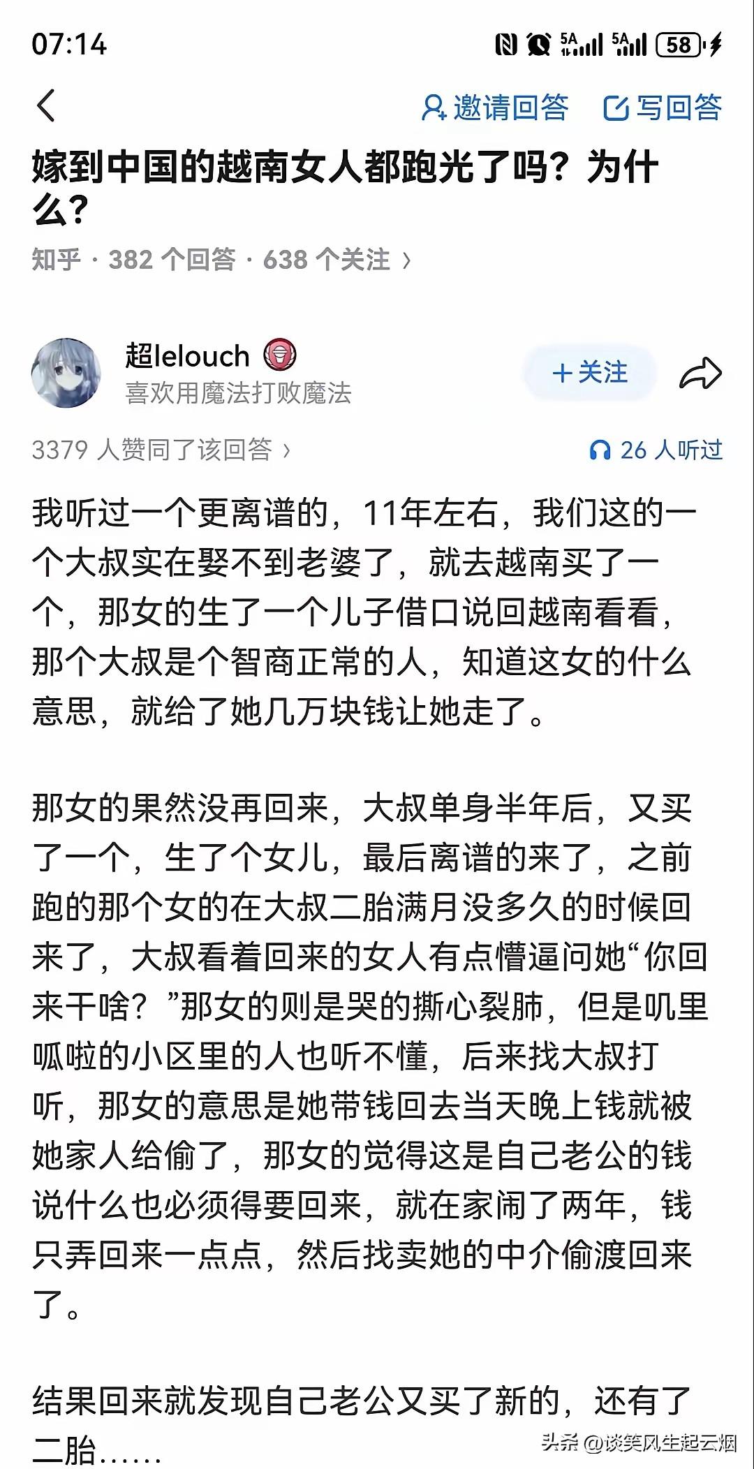 国人去东南亚买媳妇已经多年了。 说实话能在国内娶媳妇,谁不想娶?这不是条件达不到,彩礼给不起,车子和房子都凑不齐,才被迫去东南亚找媳妇么。头顶有头发,哪个愿意做秃子,不是条件确实达不到嘛。 去了东南亚买媳妇,最大的弊端,就是语言和习俗不一样,很难双宿双飞。好处就是便宜,娶个东南亚的媳妇,三五万打底,七八万顶天的价格,努把力是可以达到的。 最大的问题,就是东南亚的媳妇容易跑。其中越南媳妇最容易跑,缅甸和老挝媳妇跑的少。越南经济在发展,所以见识多,不怎么收心。而缅甸由于一直打仗,缅甸媳妇是不愿意回到缅甸的,害怕回去就回不来了。老挝媳妇比越南媳妇本分,老实的多。 说实话国内男子是有心理准备的,只要买来的东南亚媳妇,只要给自己留下一男半女的后代,媳妇跑了也就跑了,孩子留下就是最重要的。 当年孙尚香从蜀国跑回东吴,再不回来,刘备也不会在意。但是阿斗不能带走,那是刘备的继承人。所以不管咋样,东南亚媳妇只要留下孩子,跑不跑随便。 毕竟国内政策是这样的,孩子可以上国内的户口,那是中国人。但是买来的媳妇,想入国籍非常困难。孩子是中国人,小到是家族继承人,大到是国家将来的继承人,至于买来的东南亚媳妇,那就一边站吧。 这些年来,大家都有心理准备了,底线是生儿育女,只要做到了,以后跑不跑,那就随意了。