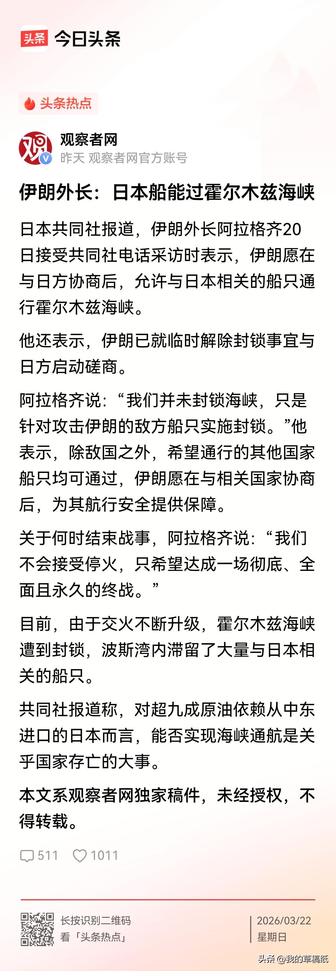 拿到伊朗单独发的霍尔木兹海峡通关卡,日本却像接了个烫手山芋!网友评论,伊朗这是玩“二桃杀三士”! 离谱又好笑! 七国刚一起骂伊朗,伊朗反手就给日本单独开绿灯,英法德意加荷六国直接看傻! 前几天还一模一样: 日本跟着美欧七国发表联合声明,谴责伊朗封锁霍尔木兹海峡。 美国还逼着日本出兵护航,拿4.5万美军、拿日本9成石油依赖海峡说事,一顿威逼利诱。 结果下一秒,伊朗直接官宣: 允许日本船只优先通行霍尔木兹海峡! 全球独一份,就给日本。 美国当场破防,前面全白忙活。 其他六国气到无语,气势直接少一半。 最惨的是日本,开心不起来,直接陷入死局。 听伊朗的: 等于背叛七国联盟,得罪美国和欧洲,以后肯定被穿小鞋。 不听伊朗的: 全世界笑他傻,白给的石油通道不要,非要出兵烧钱,国内也得骂翻。 伊朗这一招,是给糖也是挖坑, 把日本架在火上烤。 你觉得日本最后会选美国,还是选伊朗这条生路?评论区大胆说! 春日生活打卡季