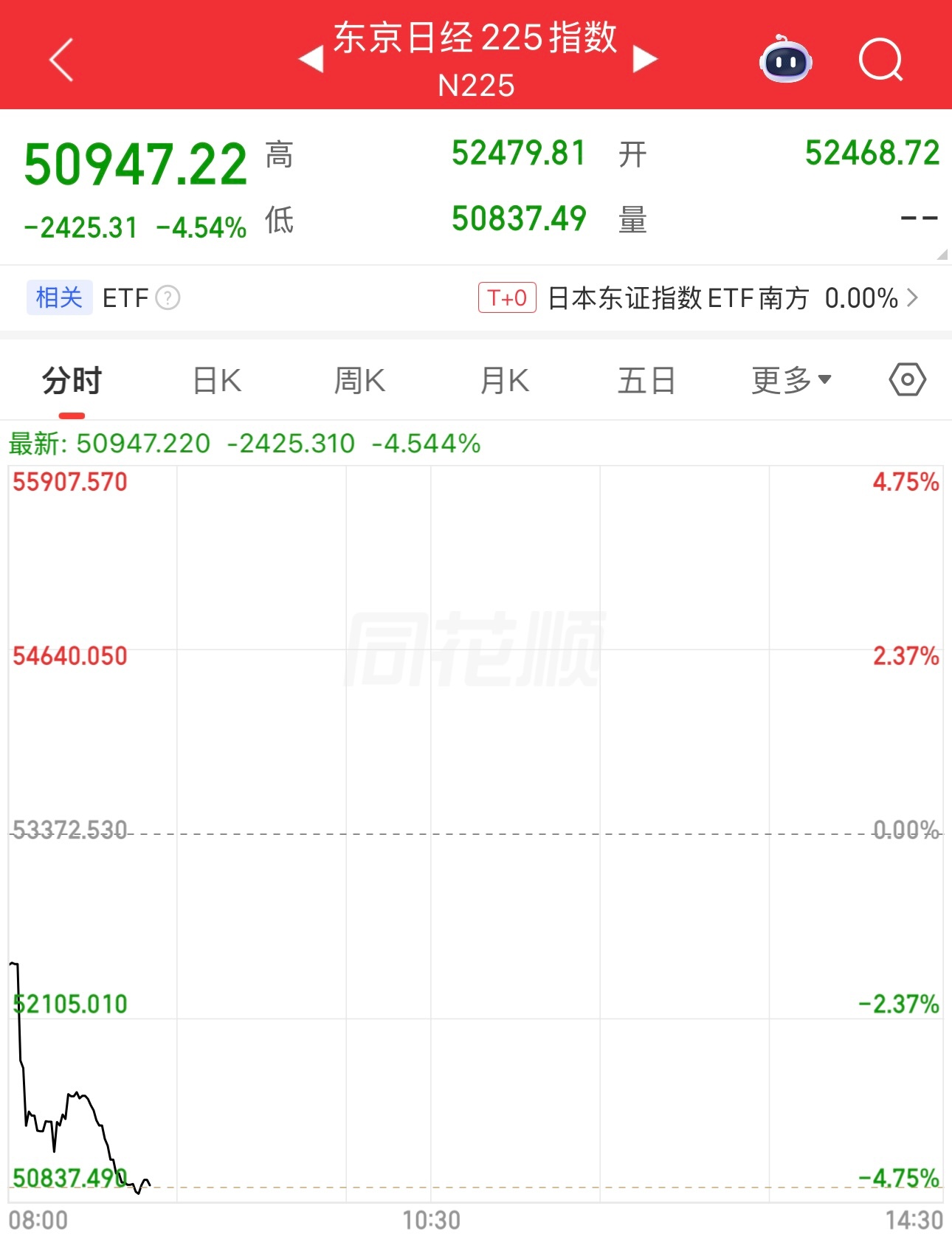 韩国股市开盘,目前跌5.69%。日本股市开盘,目前跌4.54%。要和平,不要战争