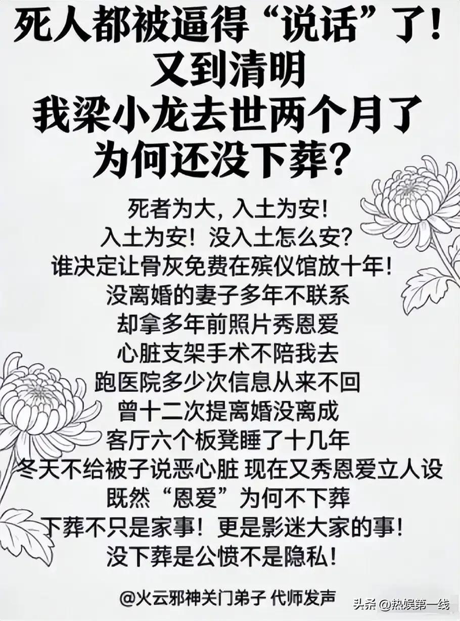 76岁梁小龙去世2月未下葬?停棺10年传闻背后,竟是这样的隐情! 火云邪神陈真,竟然入土为难?这事儿听着太魔幻了! 2026年1月,76岁的梁小龙离世,本该入土为安。可两个月过去了,遗体还在殡仪馆冷藏,甚至传出要“停棺10年”的消息。这背后哪是什么风水玄学,全是人心凉薄。 想当年,梁小龙与李小龙齐名,一句“东亚病夫”吼出了多少国人的骨气。可晚年的他,却遭遇了比病痛更冷的寒心事。据知情人士透露,家里人为了账号归属、财产分配甚至墓地问题,闹得不可开交。更离谱的是,还有“关门弟子”拿他账号发小作文,这真是死人被逼“说话”,让人唏嘘。 一代硬汉,生前打遍天下无敌手,死后却被生人琐事困住。这哪里是停棺,分明是人心的照妖镜。老爷子一生刚正,没想到身后事却如此坎坷。 你说,面对这种“身后名”与“眼前利”的撕扯,咱们普通人该怎么看淡生死呢?