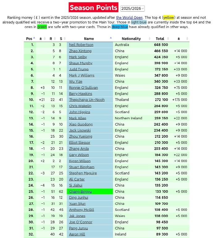 斯诺克:2026玉山世界公开赛赛后最新世界排名+单赛季排名 世界排名↓ 凭借玉山17.5万英镑冠军奖金,塔猜亚的世界排名由第39位提升到第22位。奥沙利文收获7.5万英镑亚军奖金,排名上升到第10位。 特鲁姆普扣掉前年玉山冠军奖金,仍然拥有164万英镑,位居世界第一。威尔逊第二,罗伯逊第三,威廉姆斯第四。这应该是史上首次同时有4位选手奖金排名都超百万。赵心童97万英镑排在第五,有望继续提升排名。希金斯第六,塞尔比第七,墨菲第八。肖国栋上升一位到第九。霍金斯第11,吴宜泽第12,韦克林第13,艾伦第14,斯佳辉第15。 扣掉两年前的玉山亚军奖金,丁俊晖排名下滑到第16位,正式成为前16守门员! 如果接下来的巡回锦标赛,塔猜亚再度夺冠,丁俊晖就将被挤出前16,无缘直通克鲁斯堡! 单赛季排名↓ 凭借在最后时刻上演奇迹逆袭夺冠,塔猜亚的单赛季排名上升到第10位,首次入围月底的巡回锦标赛!肖国栋则被挤到第14位,无缘参赛! 如果塔猜亚在巡回锦标赛继续夺冠,将重返前16,丁俊晖将跌出前16,失去直通克鲁斯堡的资格! 就单赛季排名来说,丁俊晖这个赛季的成绩甚至不如刚刚回归职业的常冰玉。