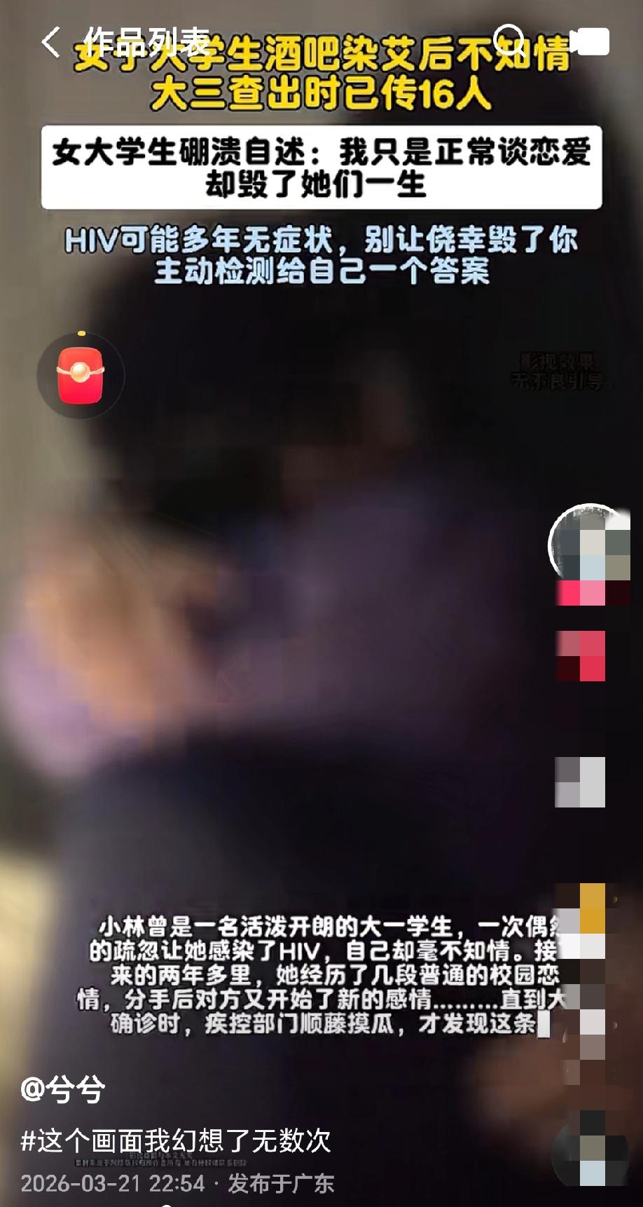 “细思极恐!”女大学生去酒吧感染艾滋后,因为没有症状,她对此豪不知情,直到大三才查出感染艾滋,这时已经传染了16人。女大学生崩溃不已:我从没想过伤害任何人,只是正常谈个恋爱,没想到会毁了16个家庭,这份无法挽回的自责才是最难以承受的。 女子小林原本是个活泼开朗的大一女生,对大学生活充满期待。 一次和朋友去酒吧放松时,她在不经意间发生了高危行为,当时没太在意,也不知道自己已经感染了HIV。 因为艾滋病初期没有明显症状,她完全没察觉身体异常,更不知道自己已经成了病毒携带者。 之后两年多,小林像其他普通学生一样,正常上课、生活,也谈了几段校园恋爱。 她真心对待每一段感情,和男友们正常交往、相处,从没想过要伤害谁。 每次恋爱结束,对方也会开始新的恋情,她从未怀疑过这背后藏着可怕的传播风险。 直到大三一次体检,小林被查出HIV阳性,这个结果像晴天霹雳,让她瞬间崩溃。 她怎么也不敢相信,自己竟然感染了艾滋病,更不敢想这两年多来,自己在不知情的情况下,已经把病毒传给了别人。 疾控部门接到报告后,立即展开流行病学调查,顺着小林的交往轨迹顺藤摸瓜,最终查清了整条传播链。 令人震惊的是,这条链条上已经有16人被感染。 得知这个数字,小林彻底崩溃了,她抱着头反复痛哭:我从来没想过伤害任何人,我只是正常谈个恋爱,怎么会变成这样…… 小林最痛苦的,不是她自己感染后的健康状况,更多的是不小心伤害了这么多家庭的自责。 一想到自己的无心之失,毁了16个人的人生,也毁了16个家庭的幸福,小林就被无尽的自责和愧疚淹没。 她知道,身体的病痛或许可以靠药物控制,但这份无法挽回的过错、对他人造成的终身伤害,是她一辈子都无法释怀的。 艾滋病存在较长的无症状期,高危行为后一定要及时检测,既是对自己负责,也是对他人负责。 小林的一次疏忽,可能酿成无法挽回的悲剧,只有保护好自己,才能守住更多人的幸福。 《民法典》第1165条规定:行为人因过错侵害他人民事权益造成损害的,应承担侵权责任。 小林在大一发生高危行为后未及时检测,因疏忽不知自身感染HIV,在后续几段恋情中未采取必要防护措施,客观上导致病毒传播。 虽主观上没有故意,但她没有尽到合理的安全注意义务,存在过失,侵害了他人健康权,需承担一定的民事赔偿责任。 同时,如果小林明知自己已经感染,仍不防护,故意和他人发生关系,那就可能触犯刑法,涉嫌故意伤害罪。 当然,小林性格单纯,对自身健康风险缺乏认知,初衷是正常恋爱,无伤害他人的主观恶意,其崩溃与自责具有真实性。 但从社会伦理看,她的疏忽不仅让16人陷入健康与家庭的双重危机,也引发了社会对防艾知识普及、校园性健康教育的反思。