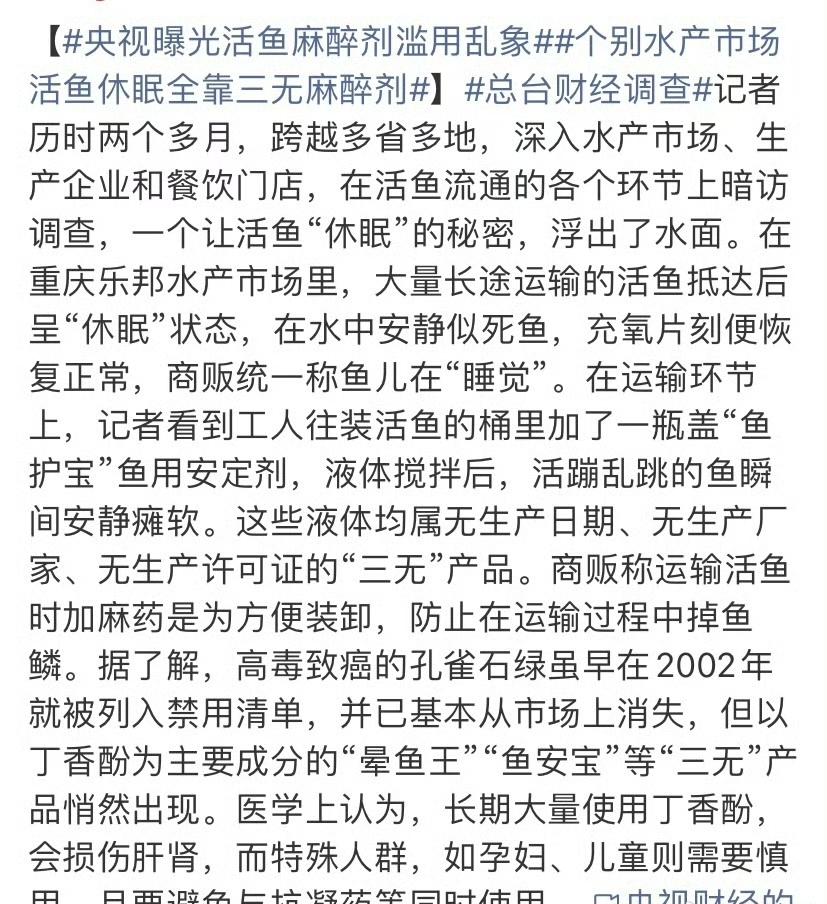 央视曝光的活鱼被人为麻醉乱象太可怕了!重庆、山东临沂、安徽宿州等地水产市场,用丁香酚、工业酒精、甲盐等让活鱼“休眠”。像重庆乐邦水产市场,“鱼护宝”让鱼安静瘫软,这还是“三无”产品。商贩为方便装卸、防掉鱼鳞就加麻药,可医学上说长期大量用丁香酚伤肝肾。山东临沂商户甚至直接用工业酒精,剂量全凭手感。 重庆市场监管局已开展排查整治,发现不少违法问题。 这些活鱼麻醉乱象不仅严重威胁着消费者的健康,更是对市场秩序的公然挑战。消费者在不知情的情况下购买食用这些被麻醉的活鱼,就如同在无形之中吃下了“定时炸弹”,谁也不知道这些麻醉剂会在未来给自己的身体带来怎样的危害。 更令人担忧的是,这种乱象可能还广泛存在于其他地区的水产市场。毕竟央视此次曝光的仅仅是部分地区,还有许多地方或许存在着同样的问题却未被发现。相关部门除了在重庆开展排查整治,也应该在全国范围内进行拉网式的检查,从根源上杜绝此类现象的发生。 消费者自身也要提高警惕,在购买活鱼时多留个心眼。如果发现活鱼表现异常安静、行动迟缓,很有可能是被麻醉过的,要谨慎购买。只有全社会共同努力,才能让水产市场恢复往日的健康与安全,让消费者能够放心地购买和食用活鱼。 麻药骗鱼 盐水防腐剂 水产麻醉鱼 水产禁药 麻药鱼 激素鱼辨别 水产保鲜剂 水产品检查 吃海鲜致癌 鱼应激出血 食材活鱼 核污染危害海鲜 惠州水产品灭菌 海鲜变质危害 娃鱼调料致癌 渔业消毒剂 来源:微博智搜