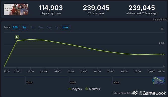 【耗资10亿开发,《红色沙漠》首日23.9万人在线,资本认为“还不够成功”?网页链接】近日,由韩国开发商Pearl Abyss倾力打造的开放世界动作冒险大作《红色沙漠》正式上线。根据SteamDB的数据,仅Steam平台游戏的同时在线人数最高一度飙升至23.9万人;与此同时,Twitch平台的同时观看峰值高达496493人,稳居当日Twitch第一热门。