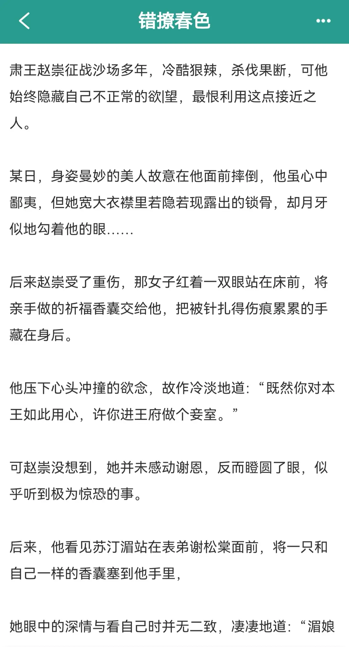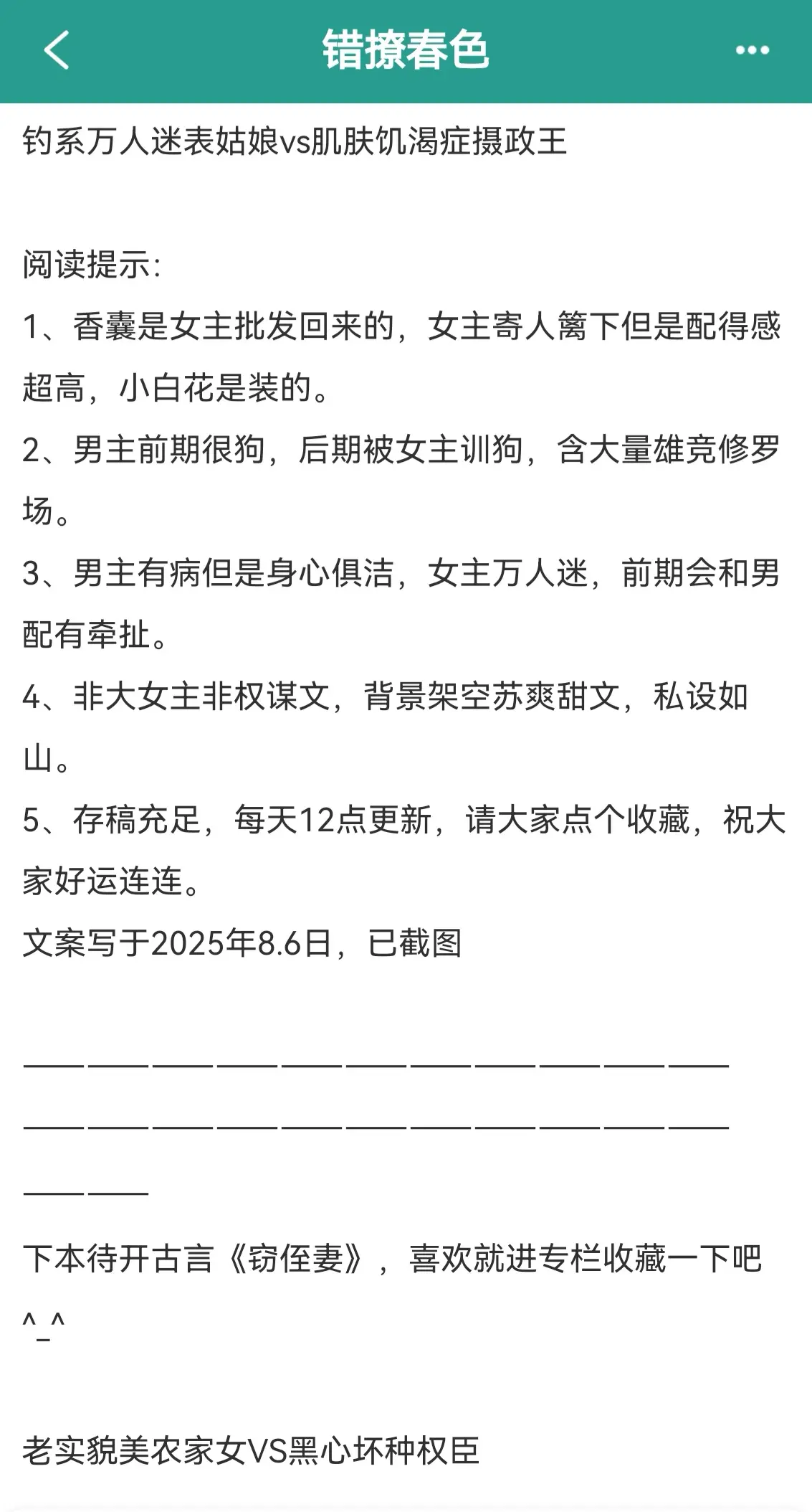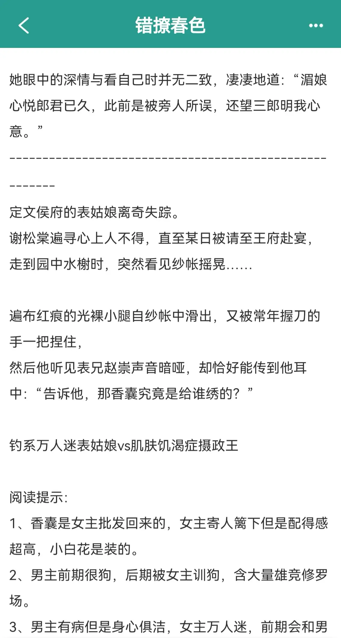 错撩春色。作者PS阅读提示: 1、香囊是女主批发回来的,女主寄人篱下但是配得感超高,小白花是装的。 2、男主前期很狗,后期被女主训狗,含大量雄竞修罗场。 3、男主有病但是身心俱洁,女主万人迷,前期会和男配有牵扯。 4、非大女主非权谋文,背景架空苏爽甜文,私设如山。 5、存稿充足,每天12点更新,请大家点个收藏,祝大家好运连连。 钓系万人迷表姑娘vs肌肤饥渴症摄政王