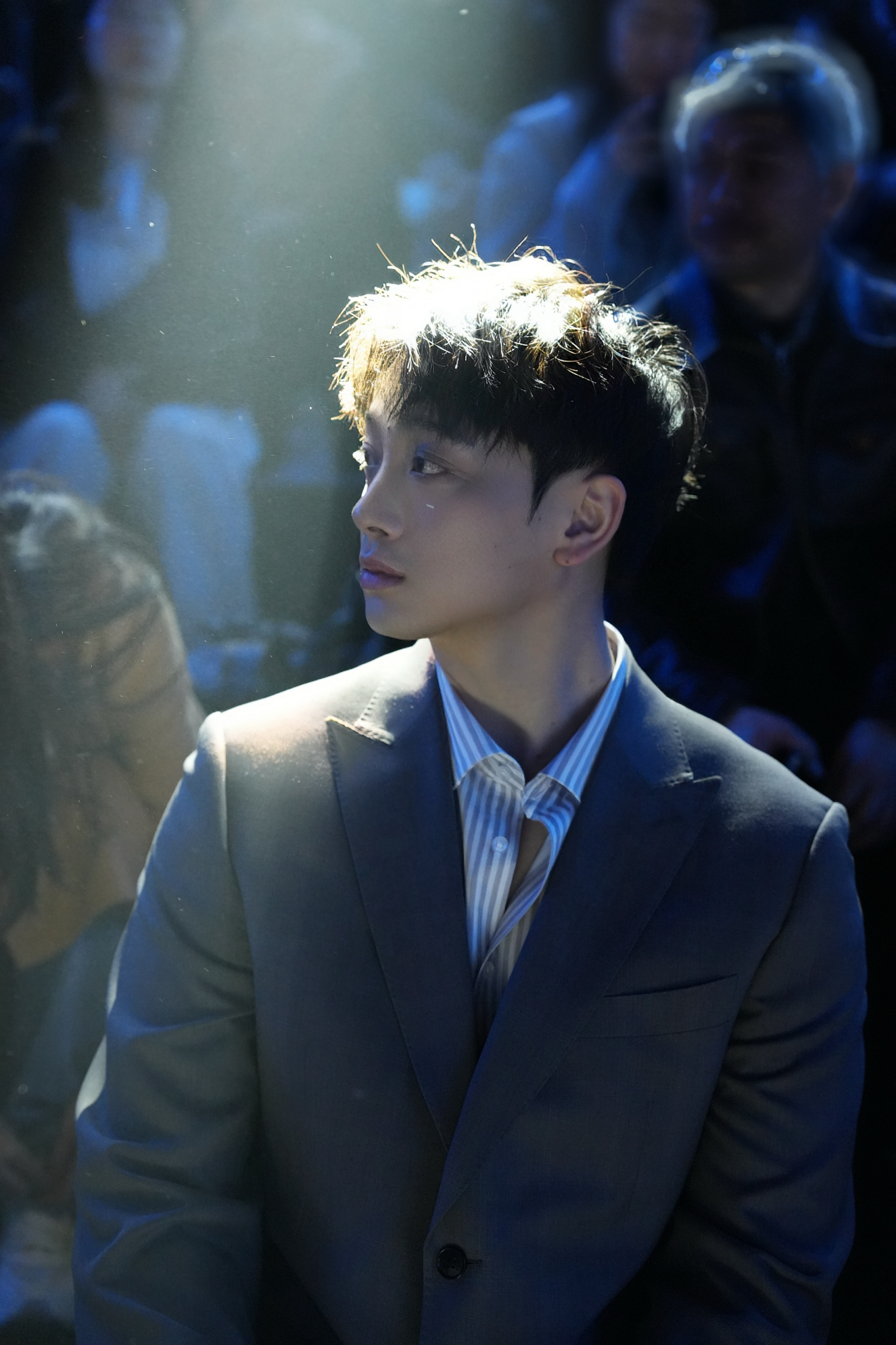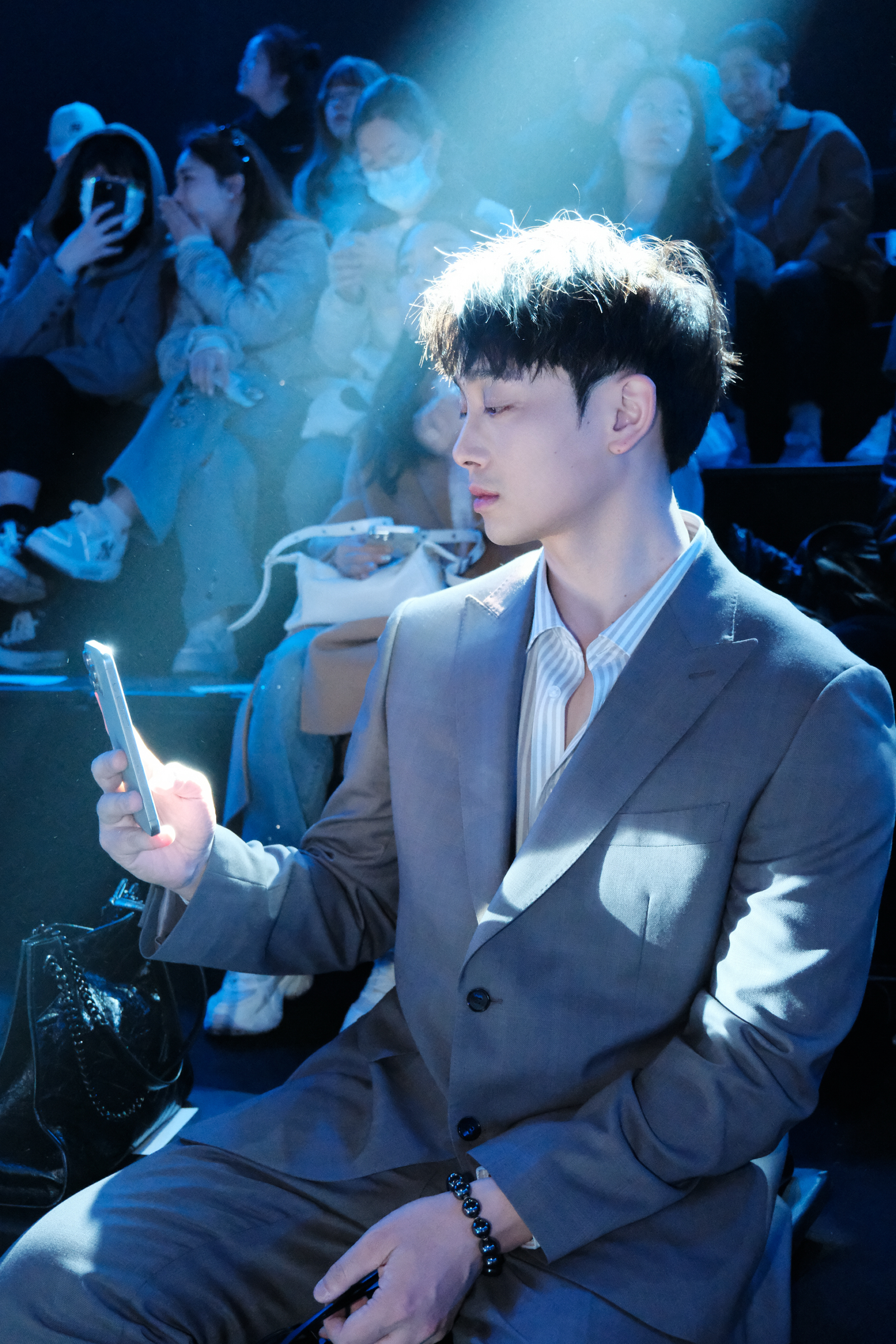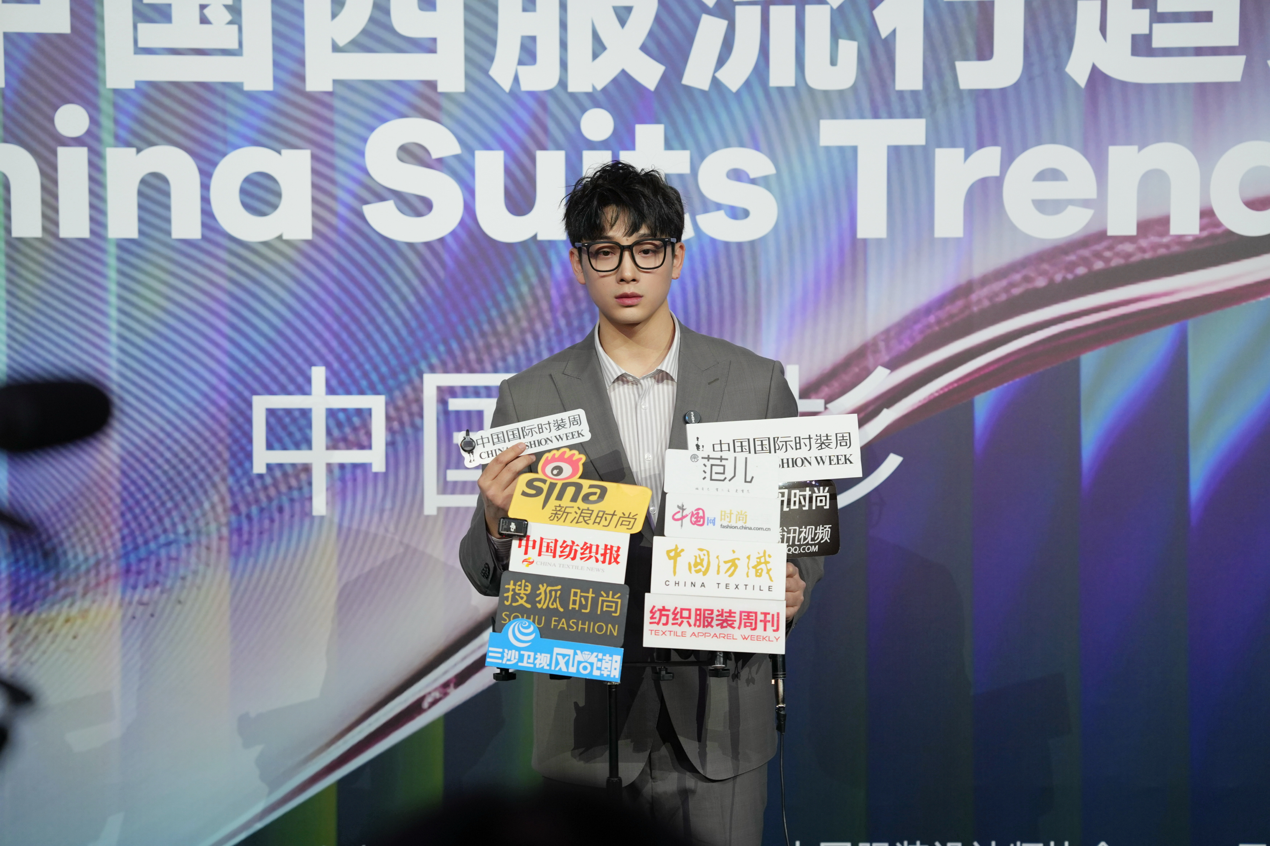 我身穿杉杉简约浅灰西装+条纹衬衫,沉稳利落,很是适配秀场氛围。