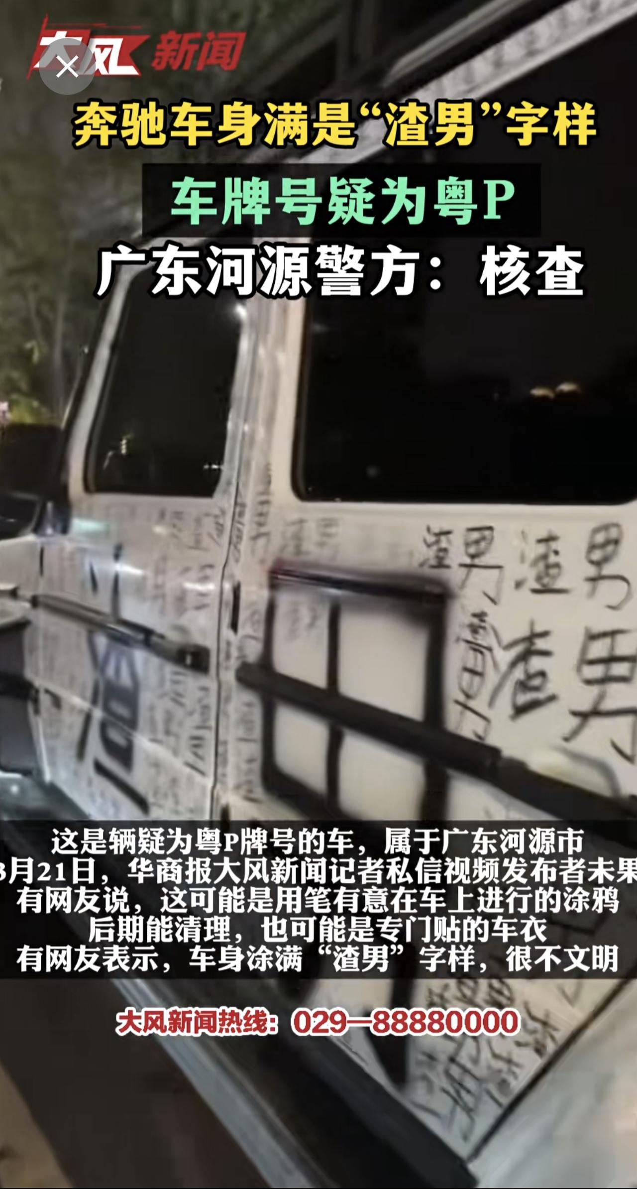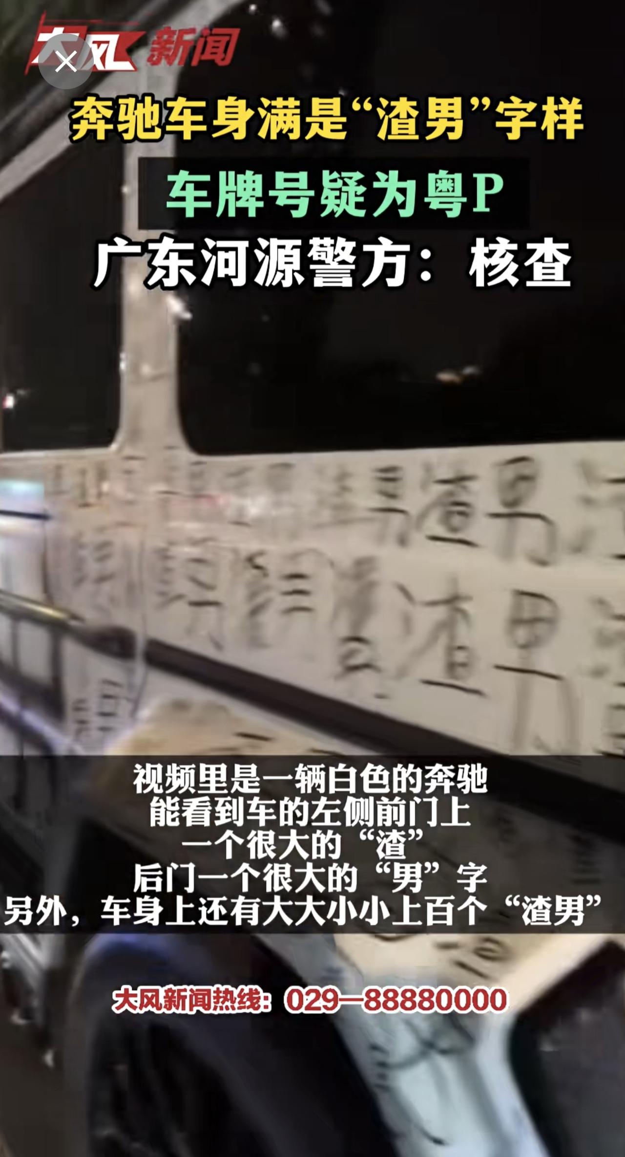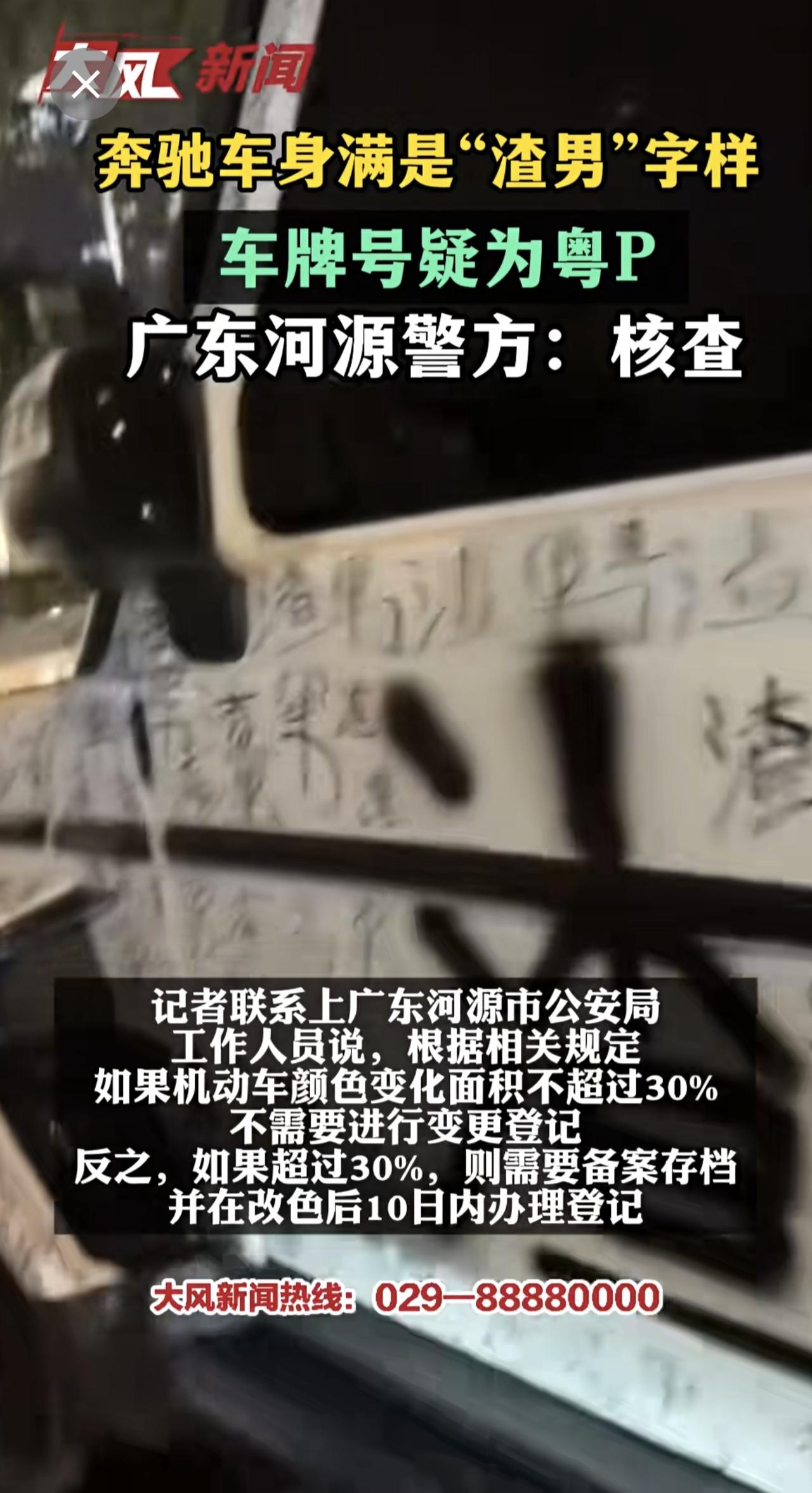奔驰车身满是“渣男”字样,车牌号疑为粤P,广东河源警方:核查